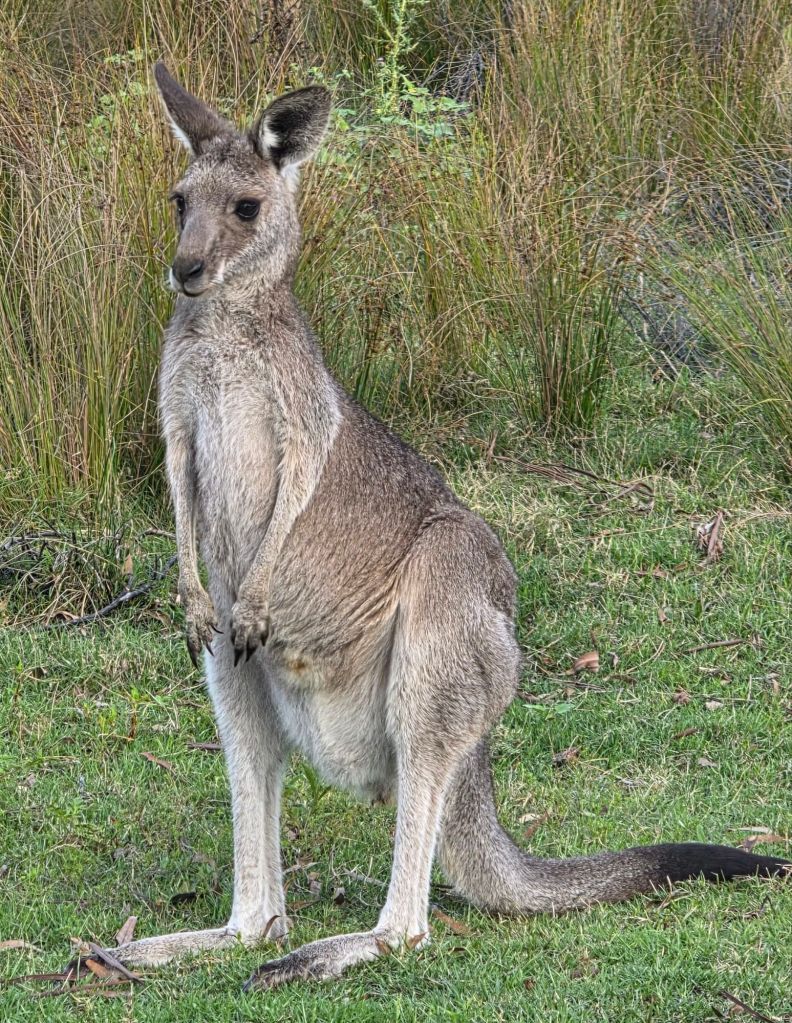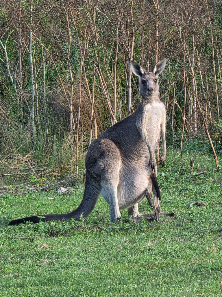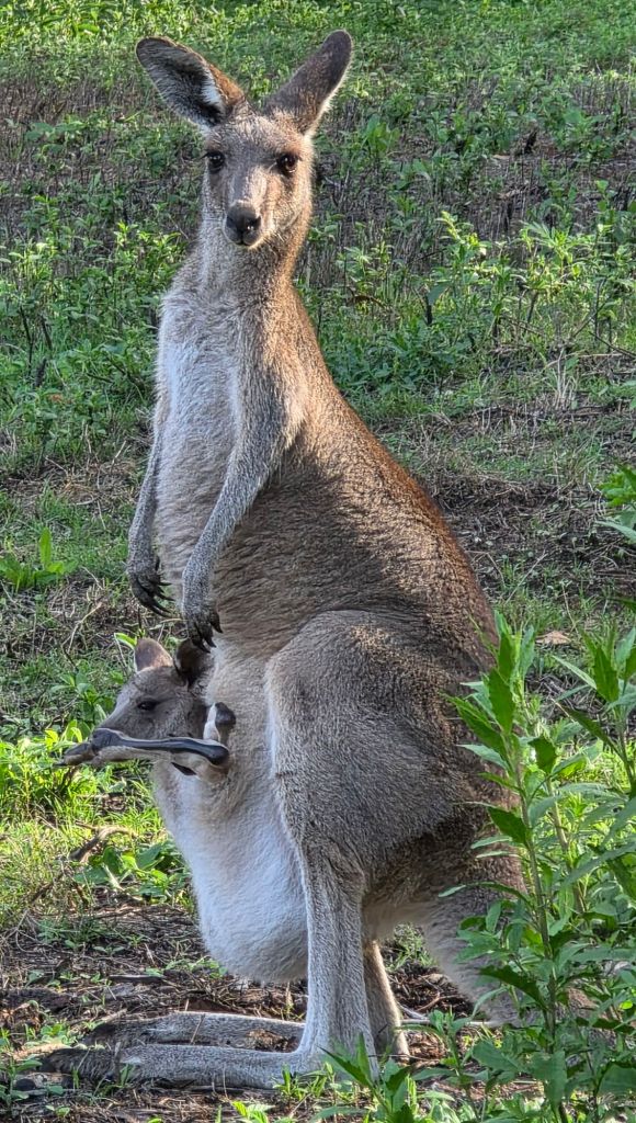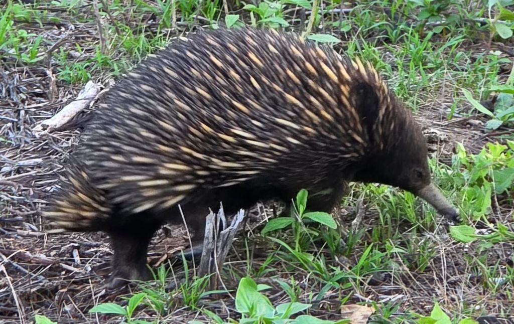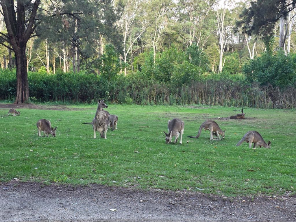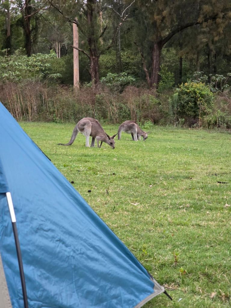 Well we finally got to the camp site and were so excited to see a kangaroo. We drive around locating a pitch, to be greeted by about 50 more kangaroos. Out of the corner of my eye I see something scurrying across the grass. We take a look and it’s a echidna (looks like a porcupine). It’s quite hilarious really because a mother and her joey also come to take a peek.