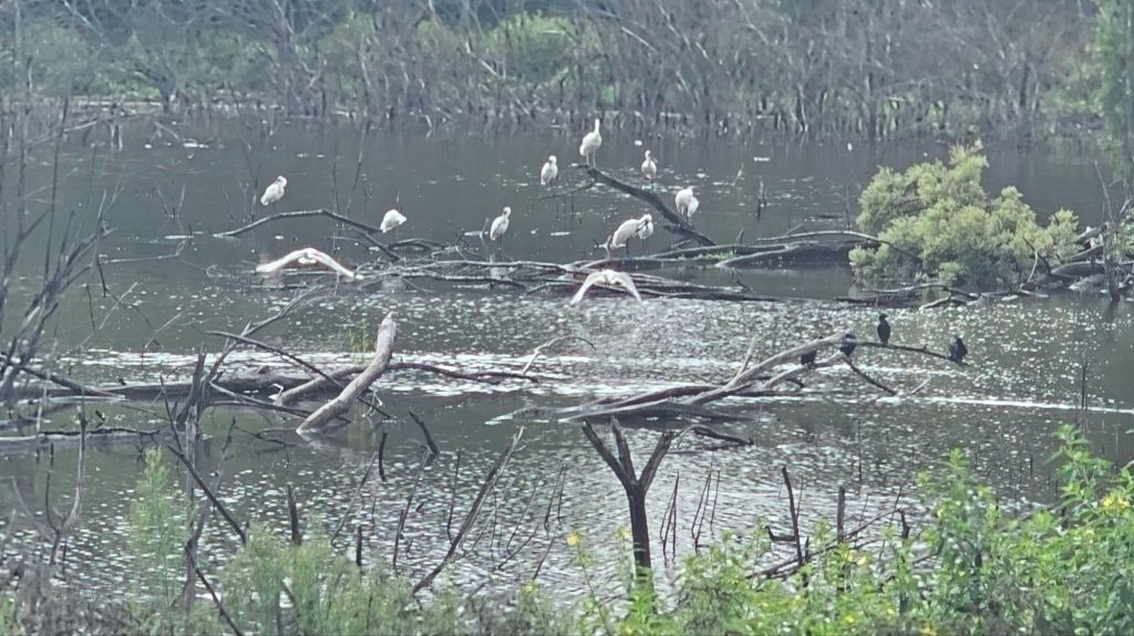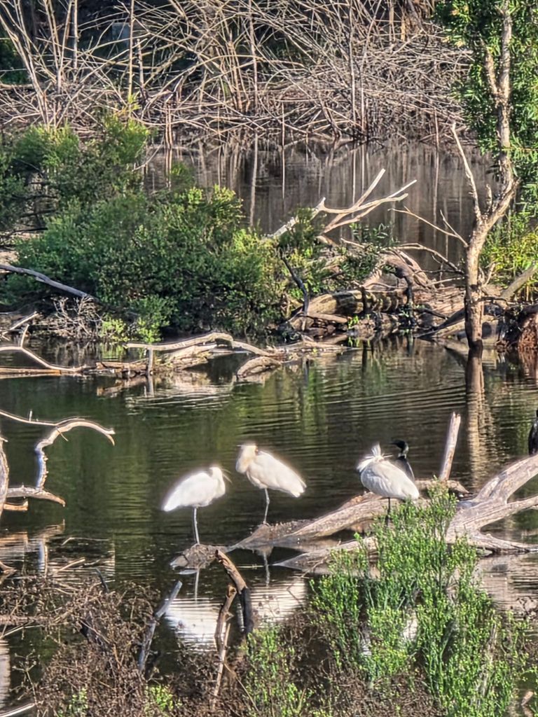We set up camp and noticed lots of activity on the river. There were a flock of pelicans perched on a long fallen tree who soon moved once the crows came to town.