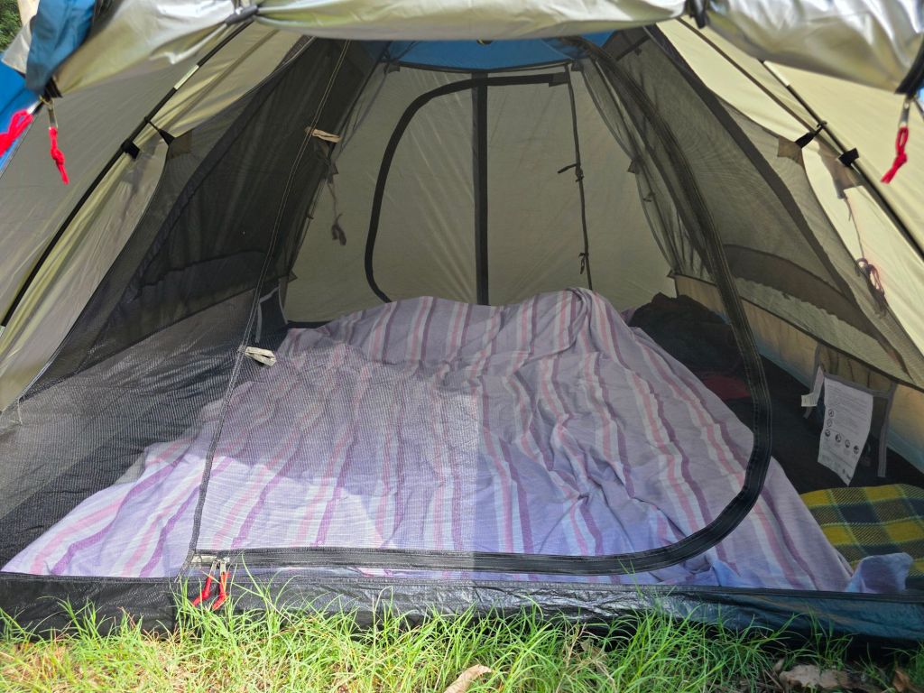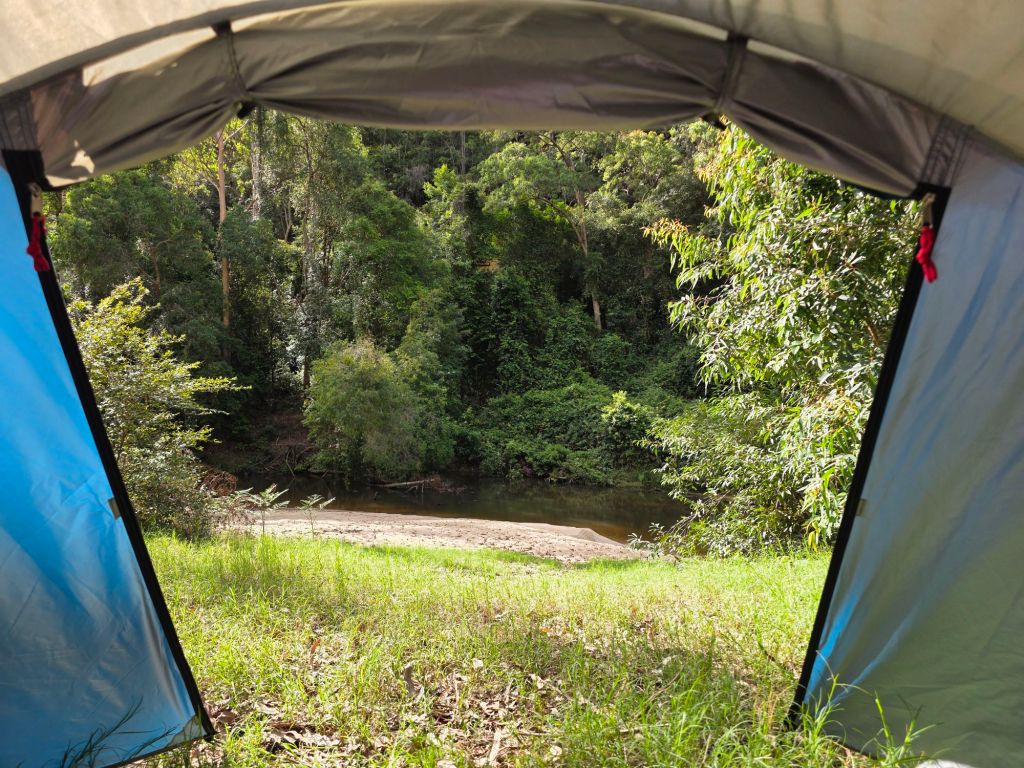 We pitched the tent overlooking the creek and set it up hopefully for a better night’s sleep than the night before, after purchasing an extra duvet for the ground.