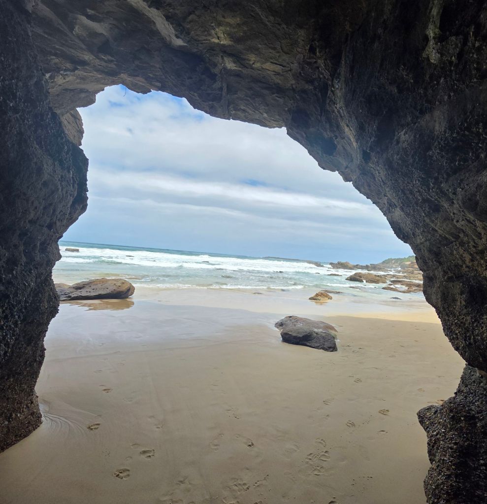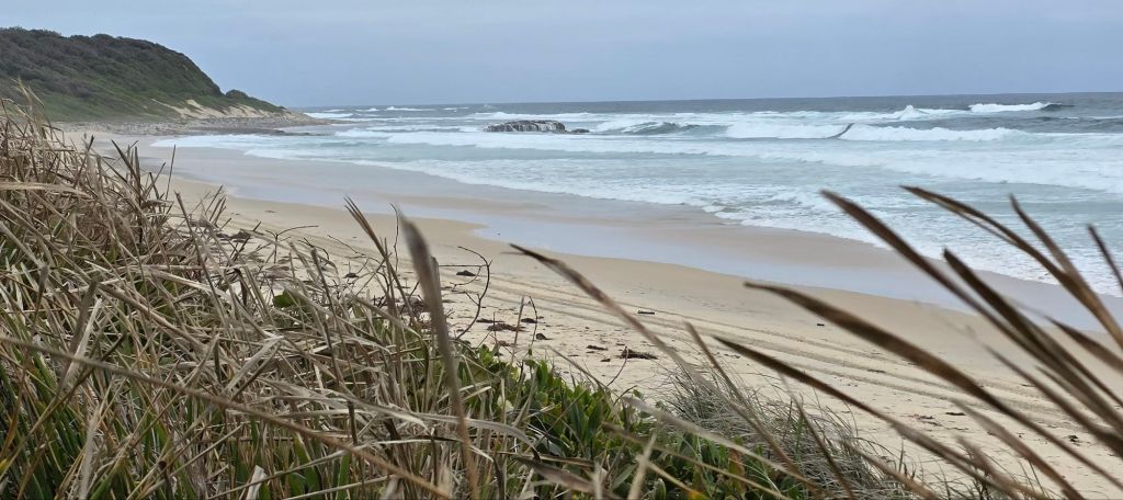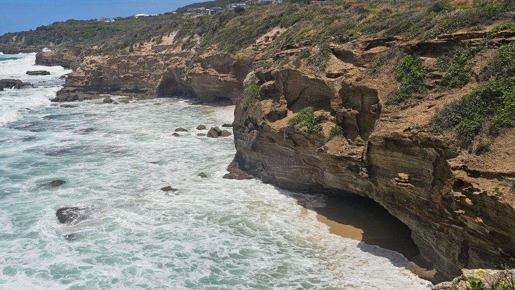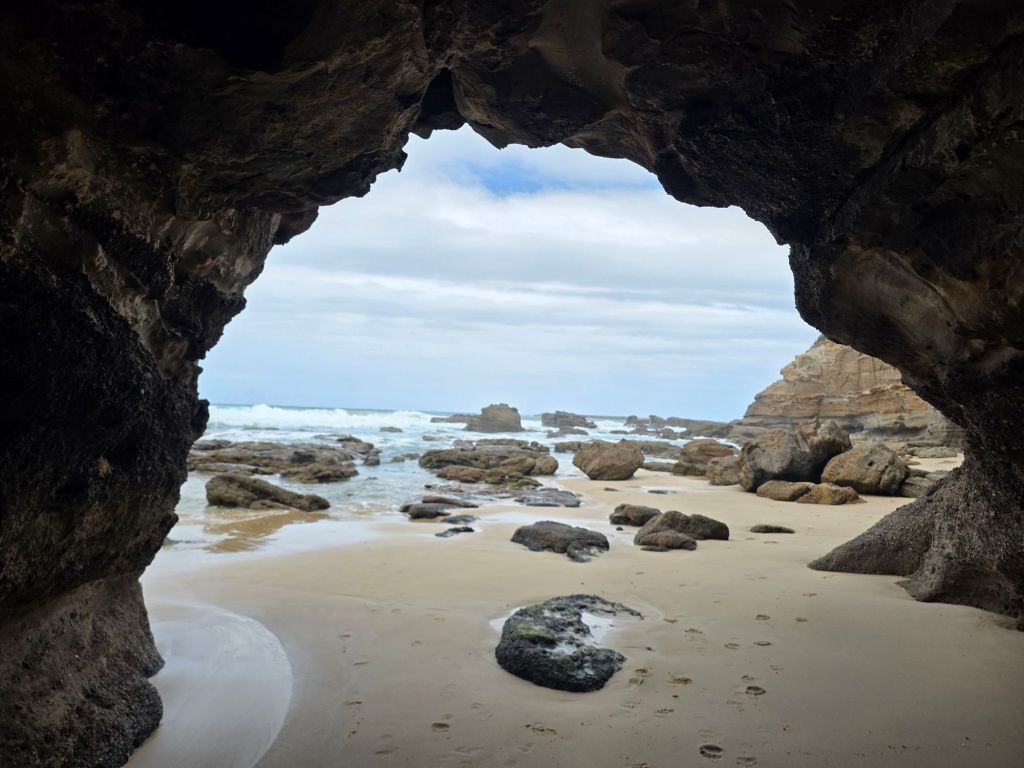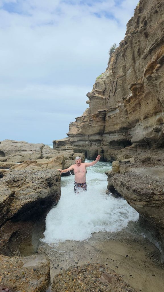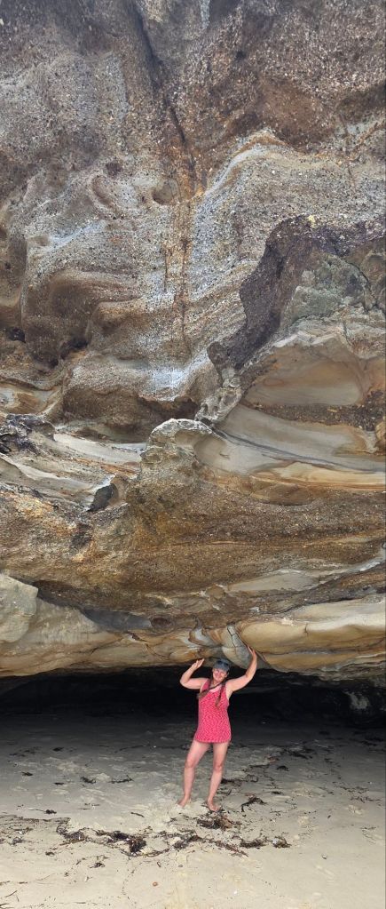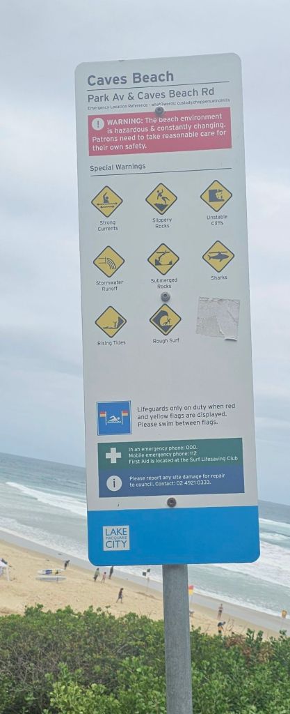 We made it to Cave Beach. As it was just after high tide the caves weren’t accessible yet, so we headed off for a walk along the golden sand. Signs were up about the rip currents and there was only a tiny area open between the lifeguard flags. After the last week’s tragic events nearly everyone was only paddling to their knees and three young surfers riding the huge waves.