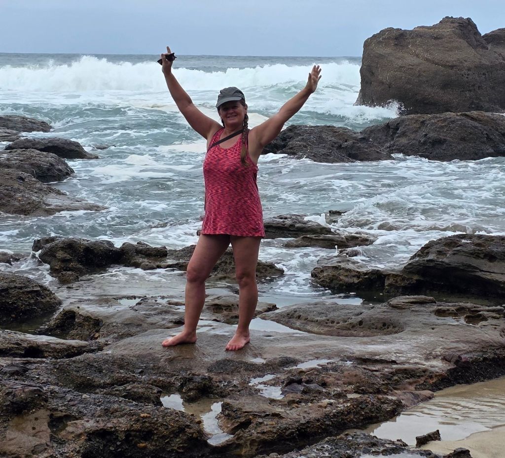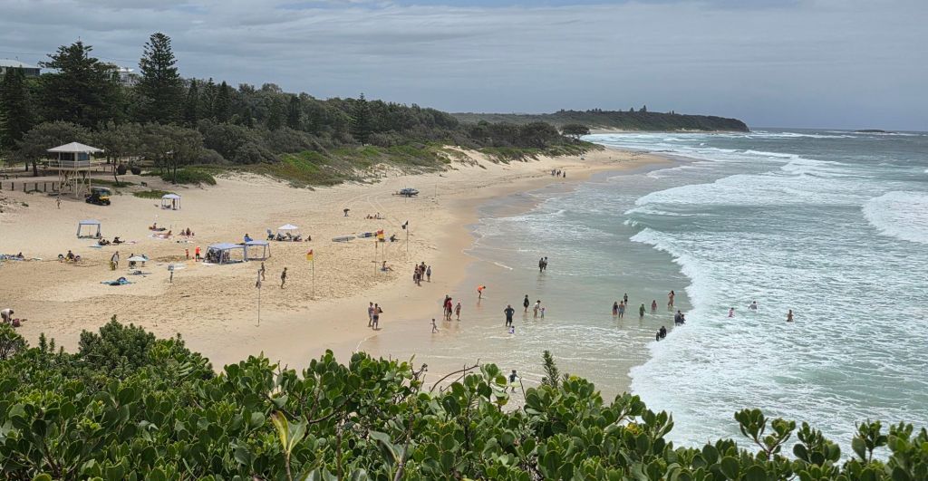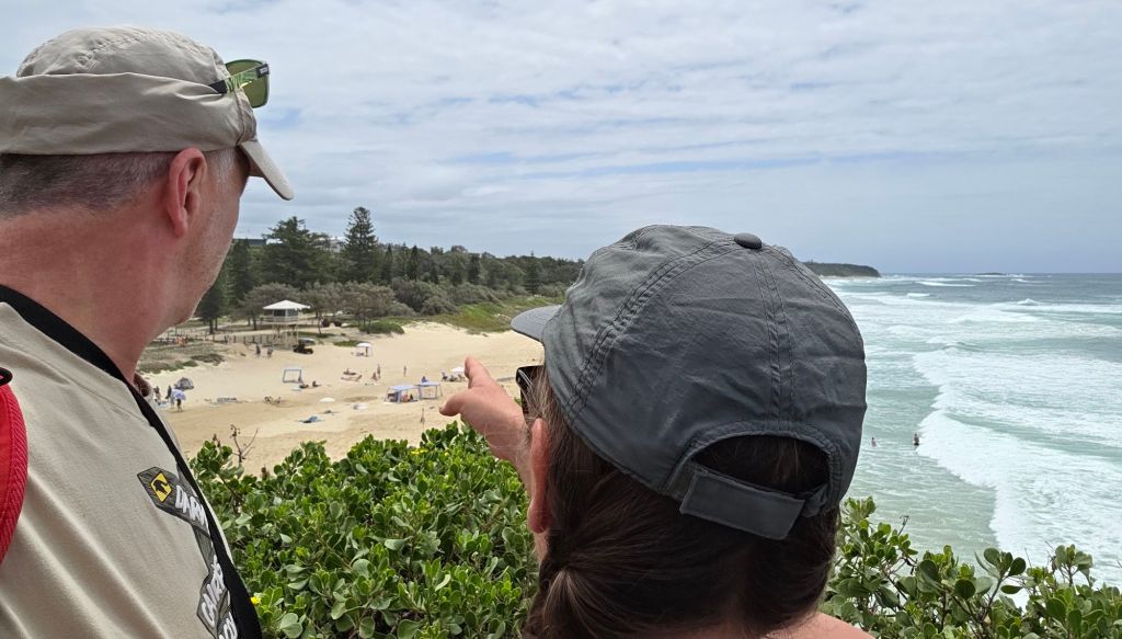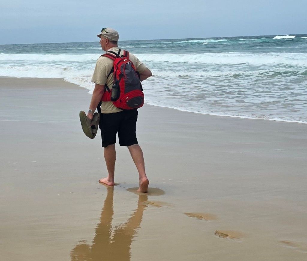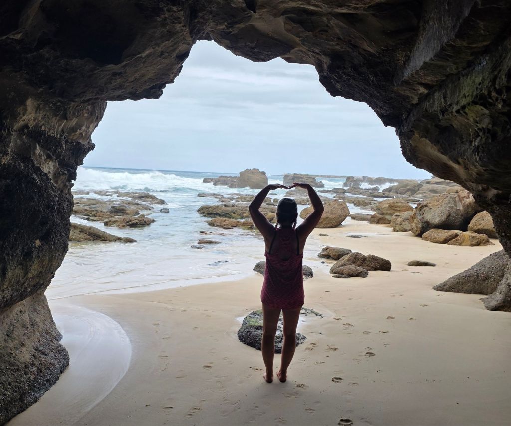 We made it to Cave Beach. As it was just after high tide the caves weren’t accessible yet, so we headed off for a walk along the golden sand. Signs were up about the rip currents and there was only a tiny area open between the lifeguard flags. After the last week’s tragic events nearly everyone was only paddling to their knees and three young surfers riding the huge waves.