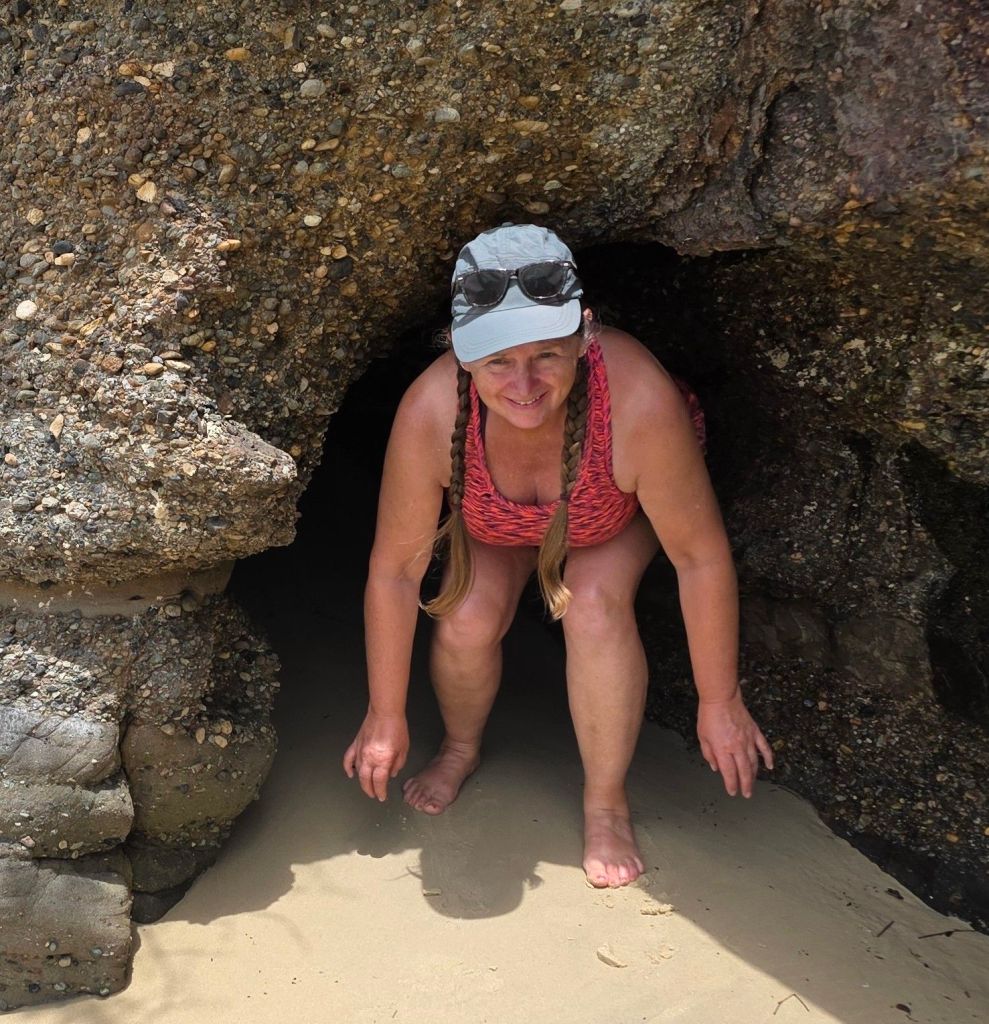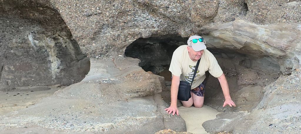 Returning to where the caves were, we could see the tide had receded enough to leave the entrances water free. A small climb over some rocks and we were in. Our kind of adventure. Working our way around the rugged coastline finding little passages that hours earlier would have been filled with marine life.
