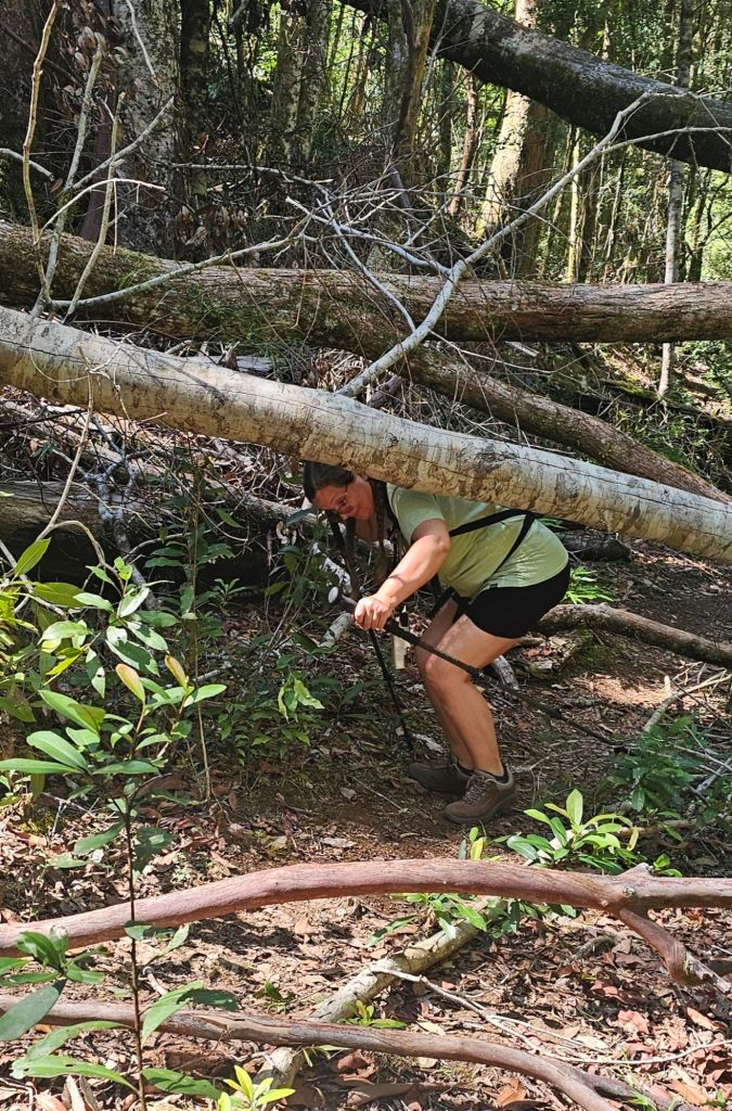 The path was harder to find than expected with debris covering the signs that were still standing. The route was covered in fallen trees to climb over or crawl under