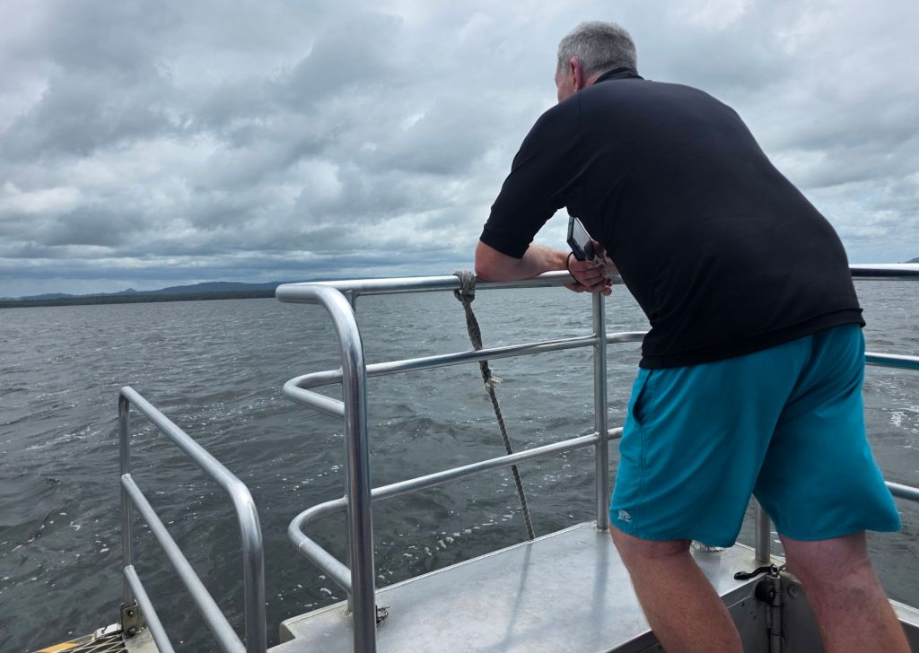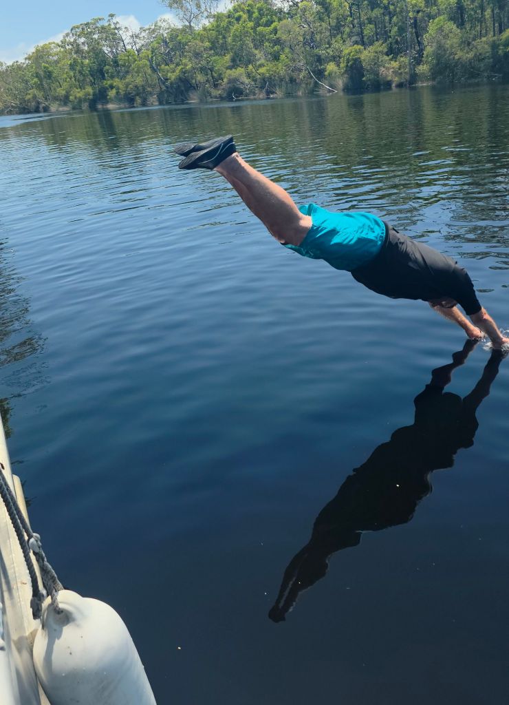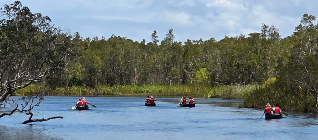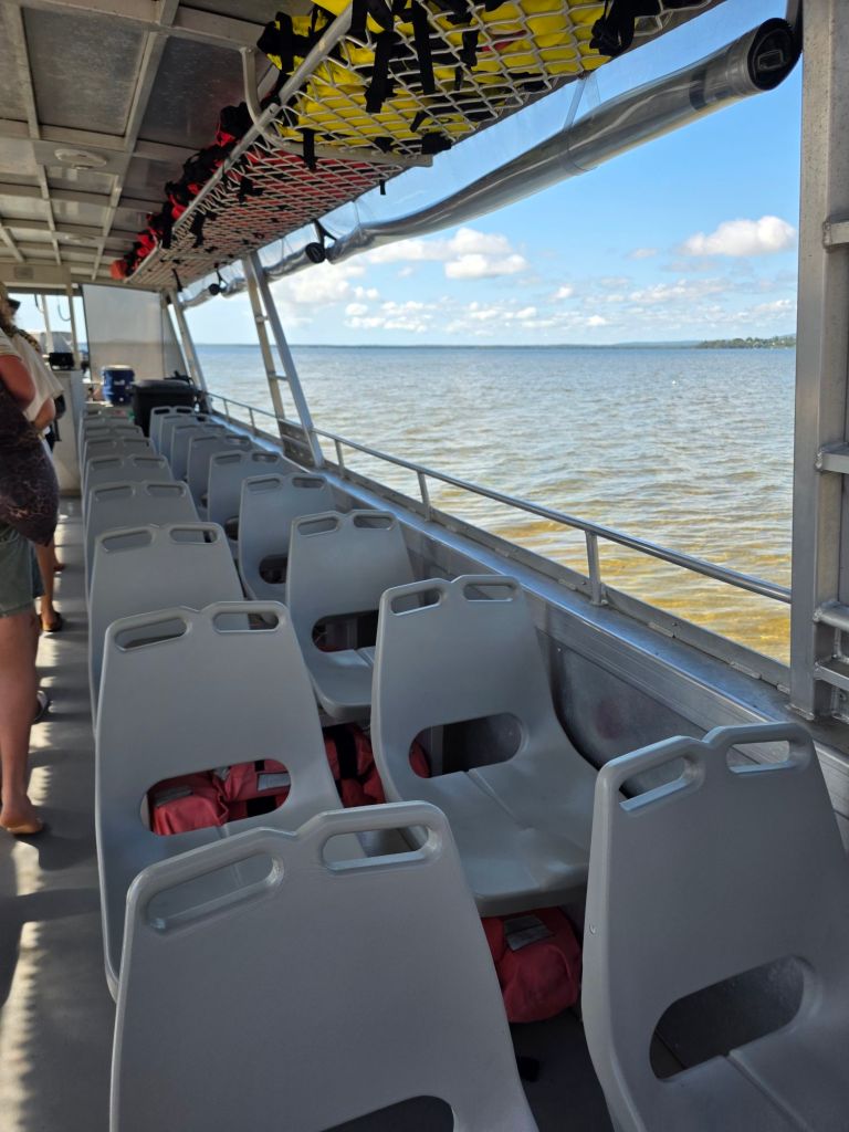 With everyone back onboard we set off back down the river and towards the information centre. Sonny showed us how to search for koalas. We soon hit the open waters of the bay. The shallow areas are known for stingray but with the choppy conditions we didn’t see any. Smoke in the distance, hopefully a BBQ rather than a forest fire. The lads pulled us back towards shore and we exited via the gangway.