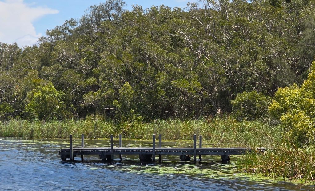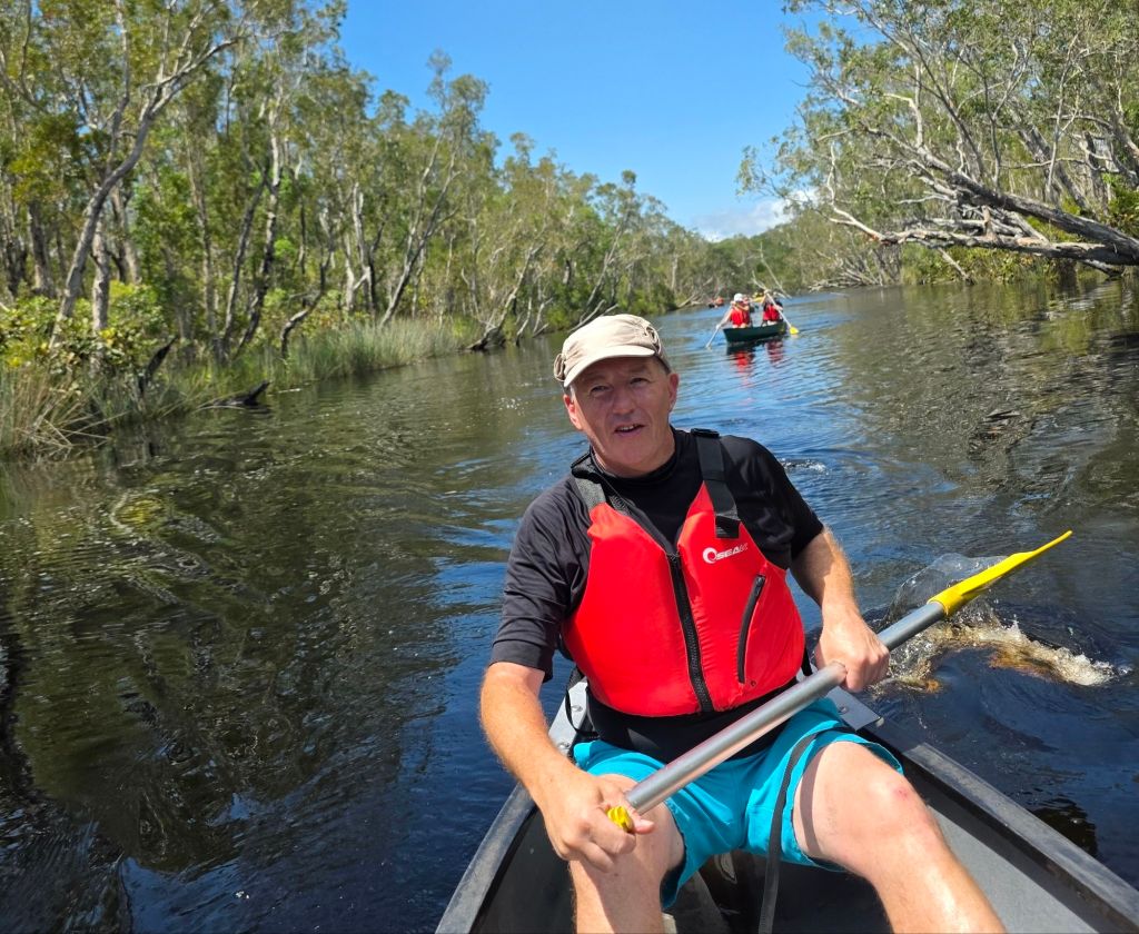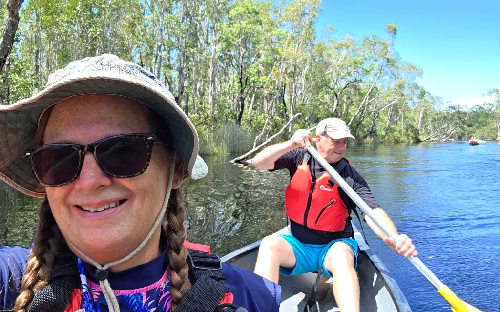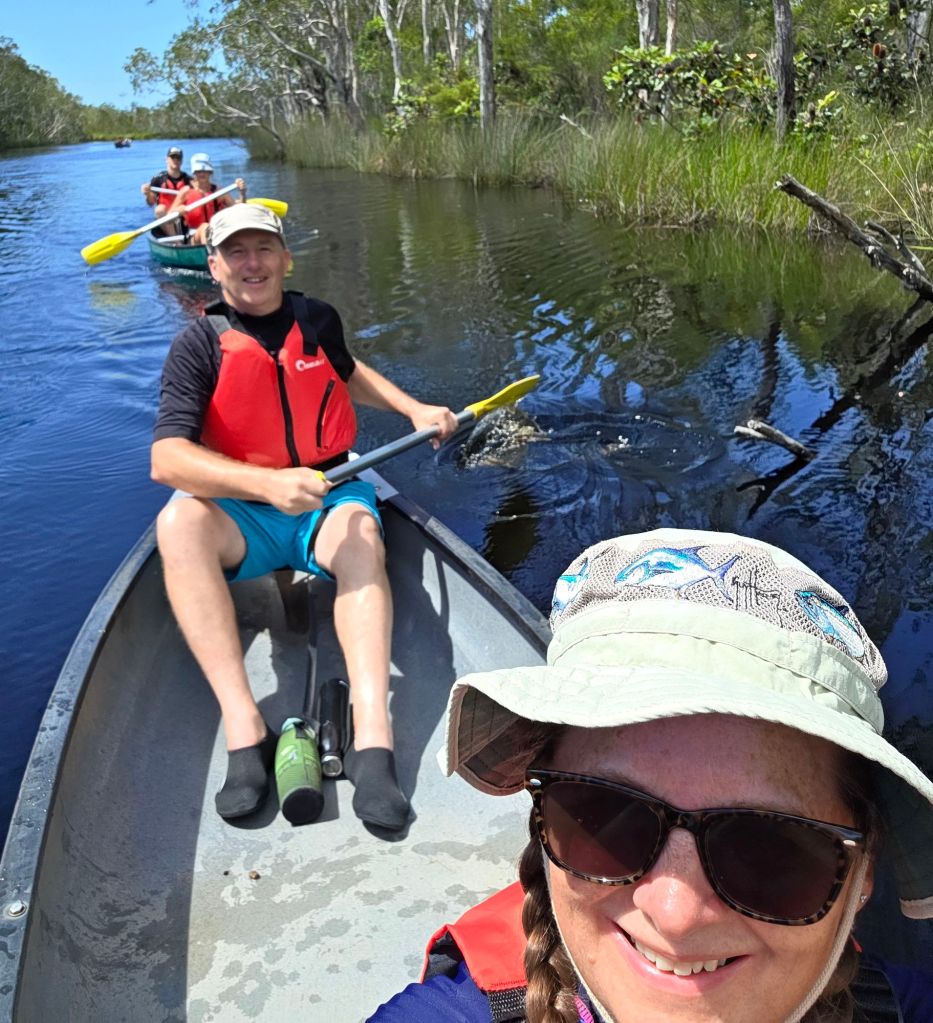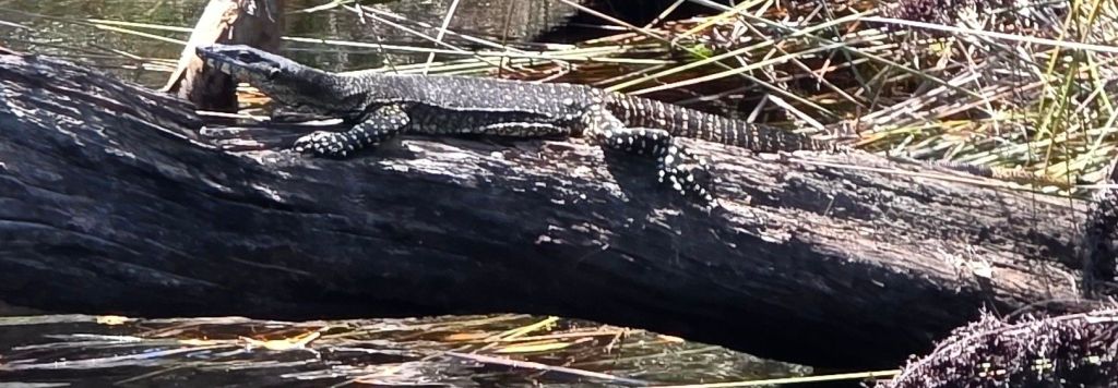 As we headed back to Fig Tree Point in the boat, Paul gave us a running commentary about the area. We spotted a lot of wildlife including a lace lizard (goanna) with its sharp claws and teeth, a king parrot and many other creatures. We soon caught up with, and overtook, the other canoeists. We arrived at our destination and had a little stroll on the jetty and walkway.