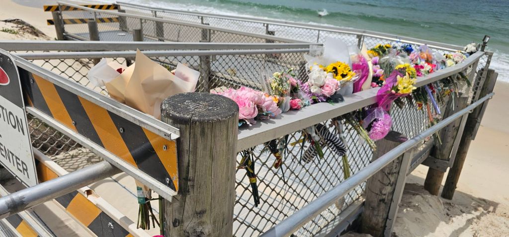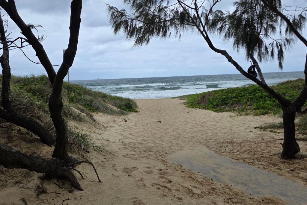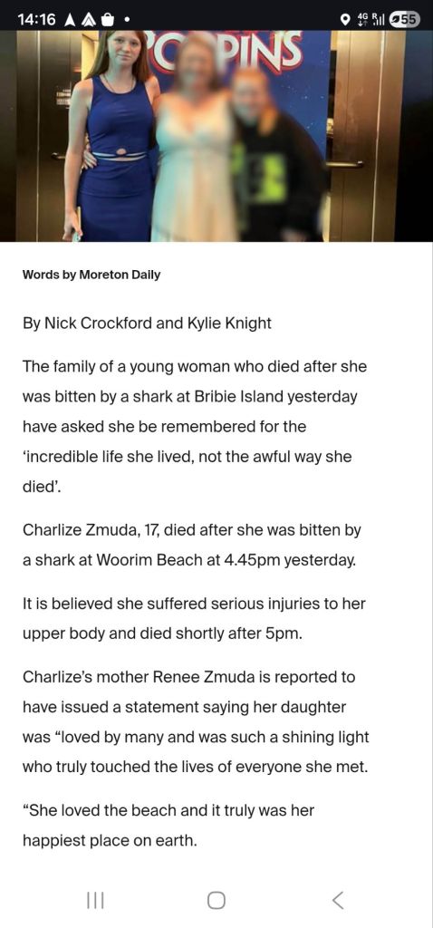 We headed to Bribie Island. Once there it was off to Woorim Beach. All along the railings were fresh flowers and a plaque in honor of a young 17 year old girl, Charlize Zmuda who’d been killed by a shark exactly one year and a day ago.