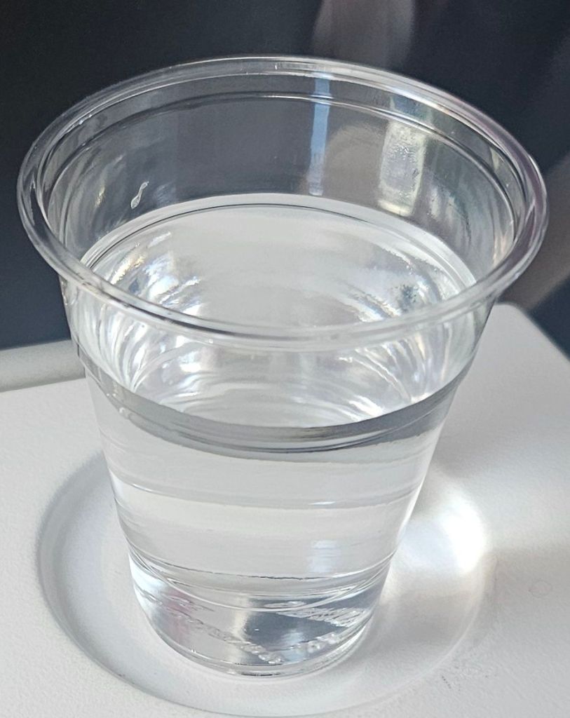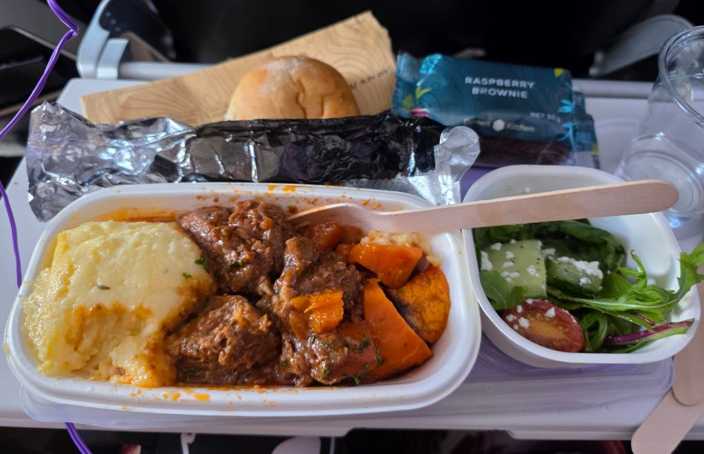 Once we’d boarded the plane we thought we’d have a bite to eat with our water, maybe a snack or the wraps we prepared yesterday. Before we knew it the air stewardess was taking our lunch order. A lovely beef, mash and veg lunch it was too, with a cake of course and a small tipple.