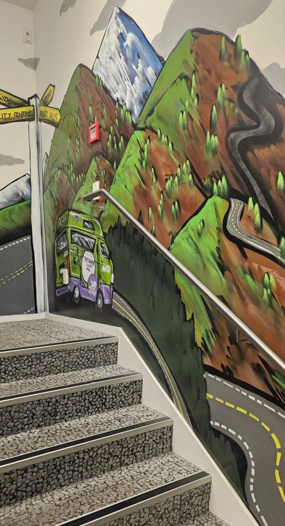 Some of the amenities. There are signs and quotes everywhere to inspire adventure and a colourful murial down the stairs wall which we hope will represent our trip – let’s wait and see.