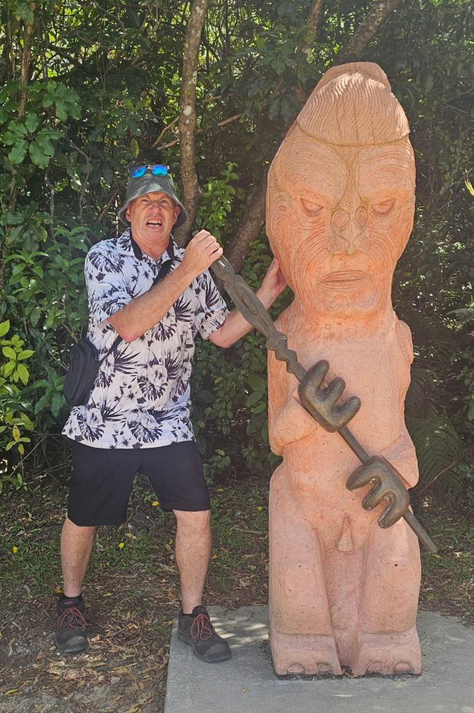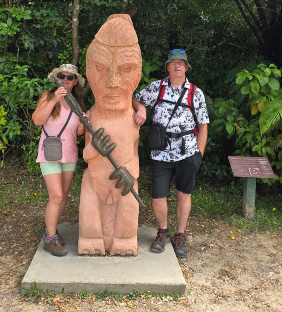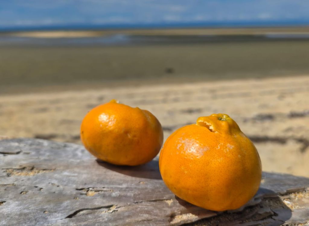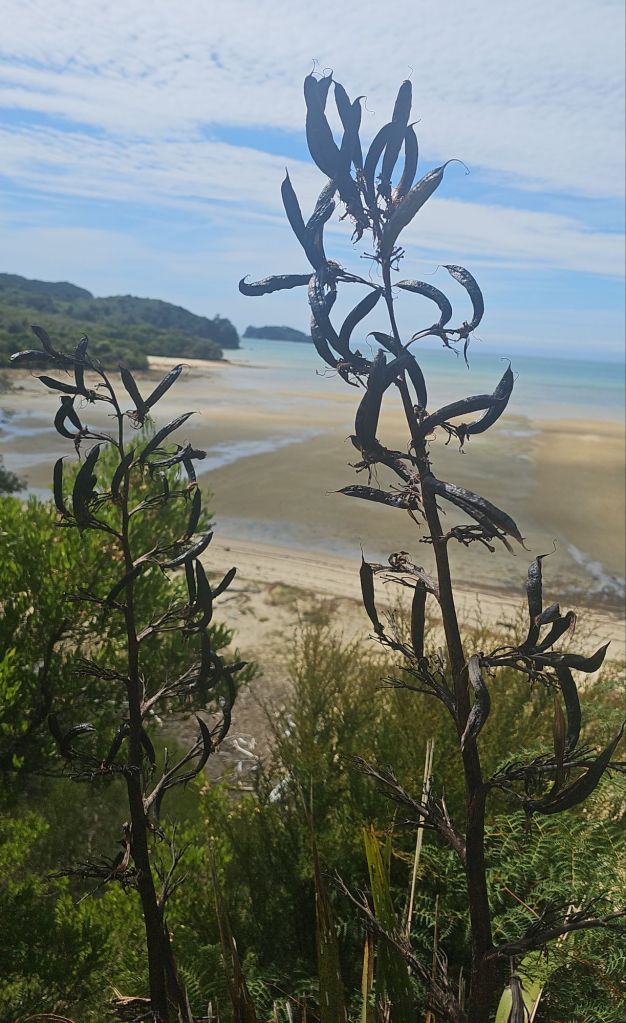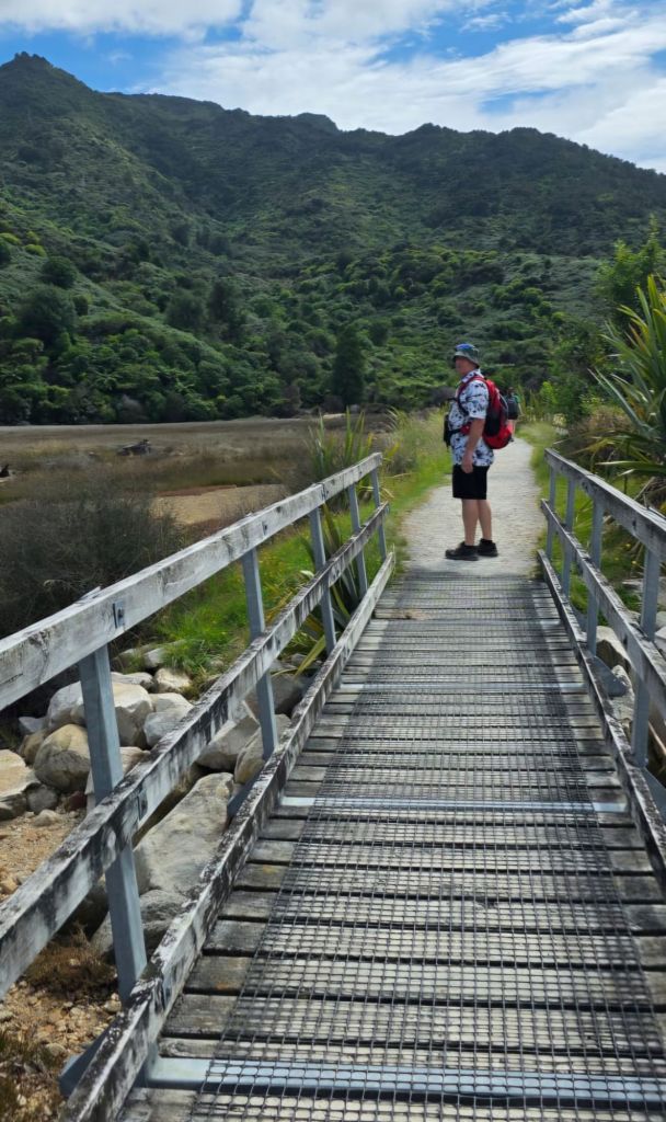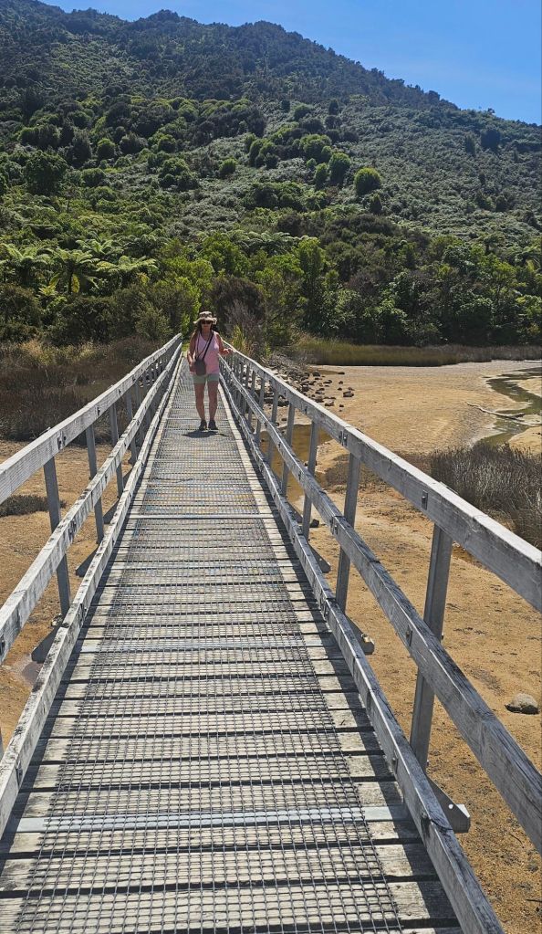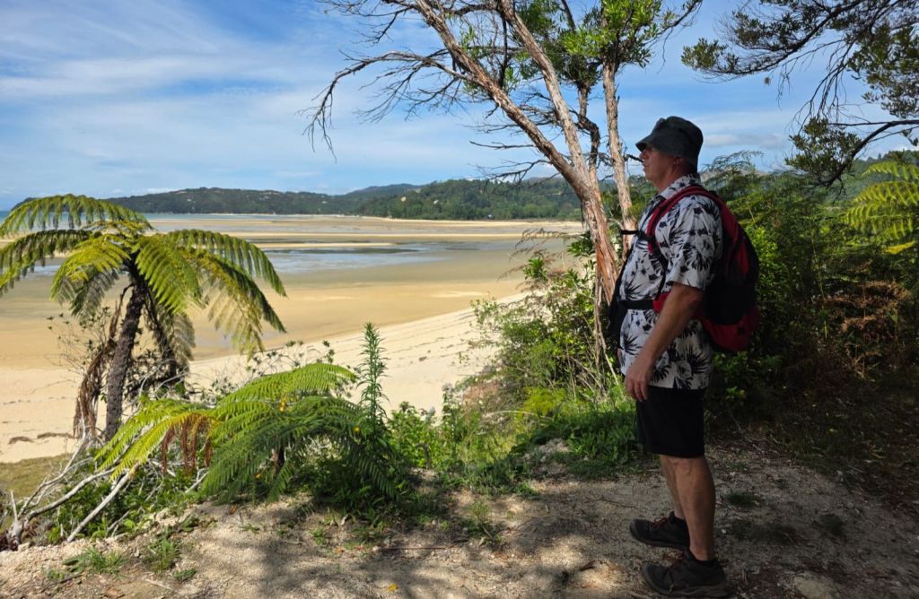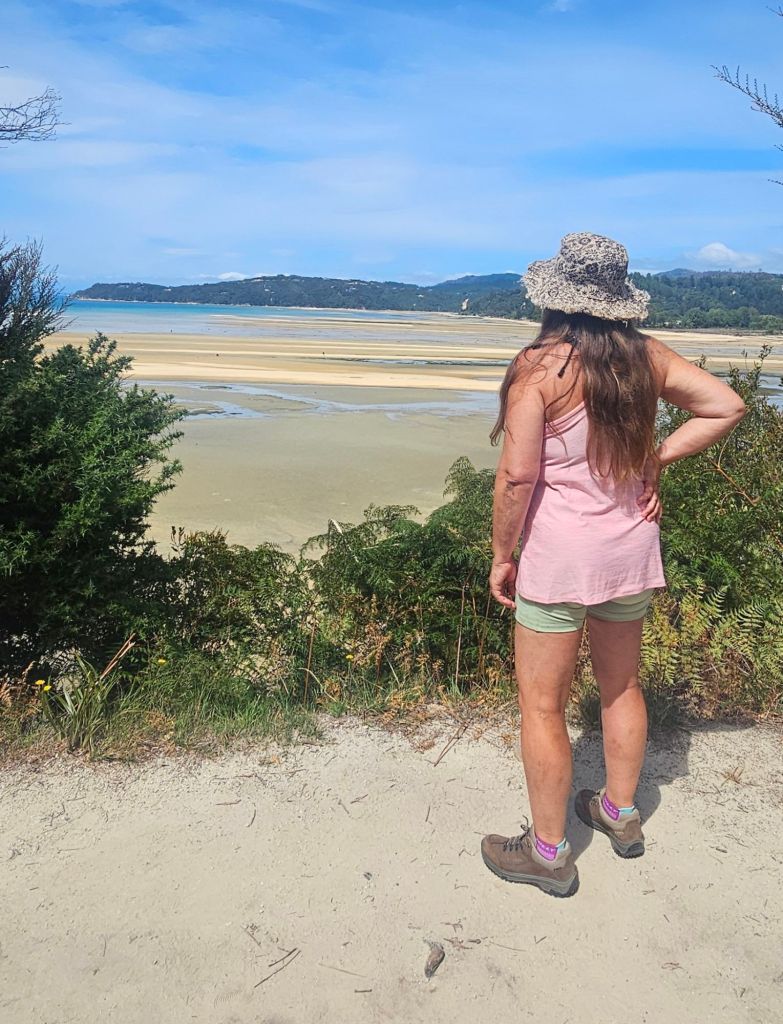 There was also a range of walks in all different directions, so we chose The Able Tasman Coastal Track which passed Stu’s Lookout. This entailed crossing a series of boardwalks across the creeks and river before ascending up the hillside through some lush vegetation and passing Porters Beach on the way. Someone had kindly left some organic mandarins on a bench with a sign to help yourself. It would have been rude not to, so we took two and ate them on Porters Beach. Somehow on the walk we both managed to have a fall. I cut my finger, whilst Sarah grazed her knee and hand. We carry a first aid kit everywhere, but on this occasion it wasn’t required as it was just pride that was dented.