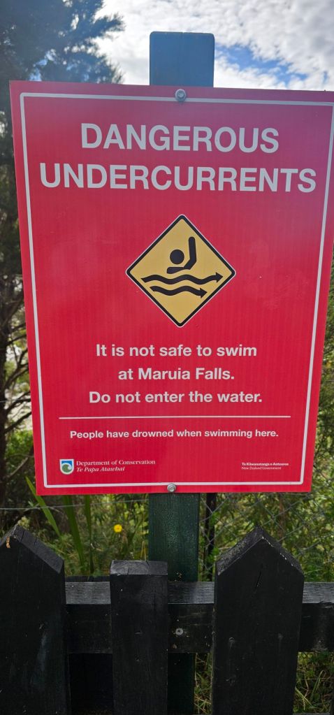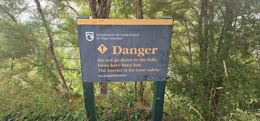 Next stop, Maruia Falls. We’ve seen some interesting wildlife signs on the way. There was a duck crossing sign just before the falls. Other signs when we got there included our usual death warning signs that we have become very accustomed to.