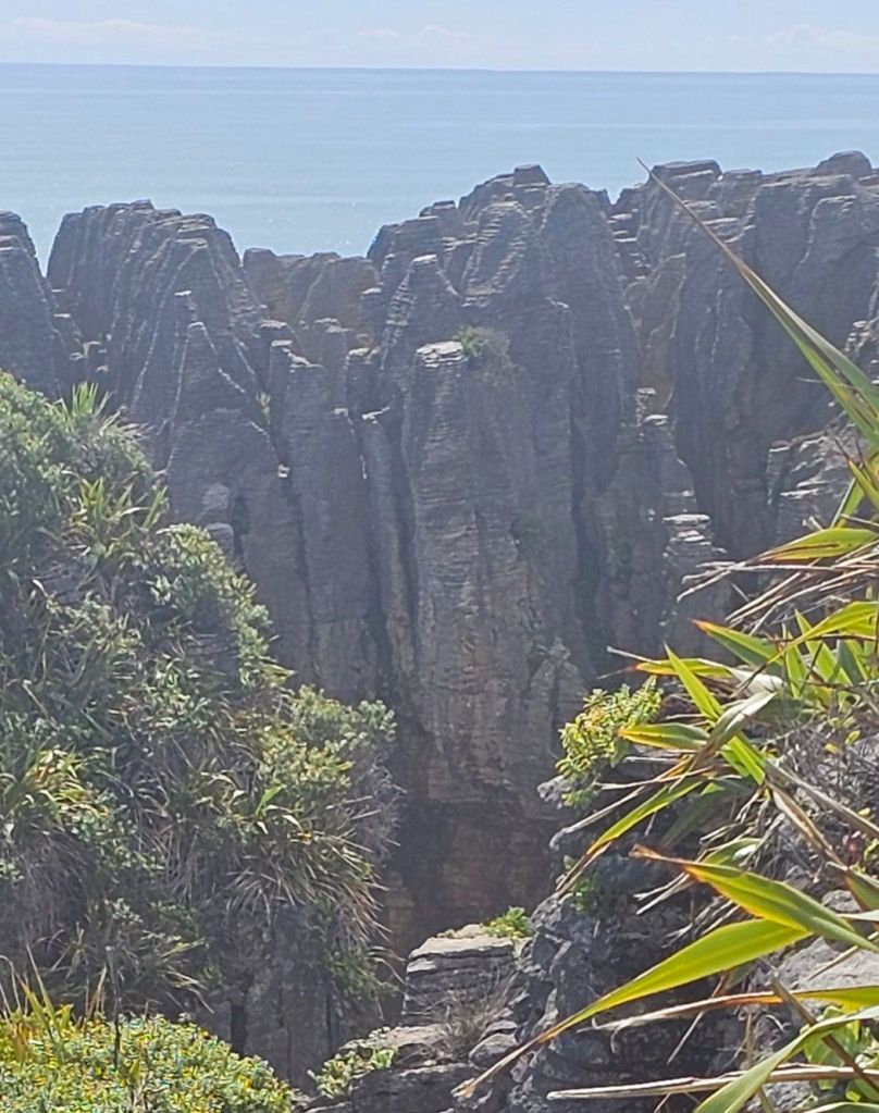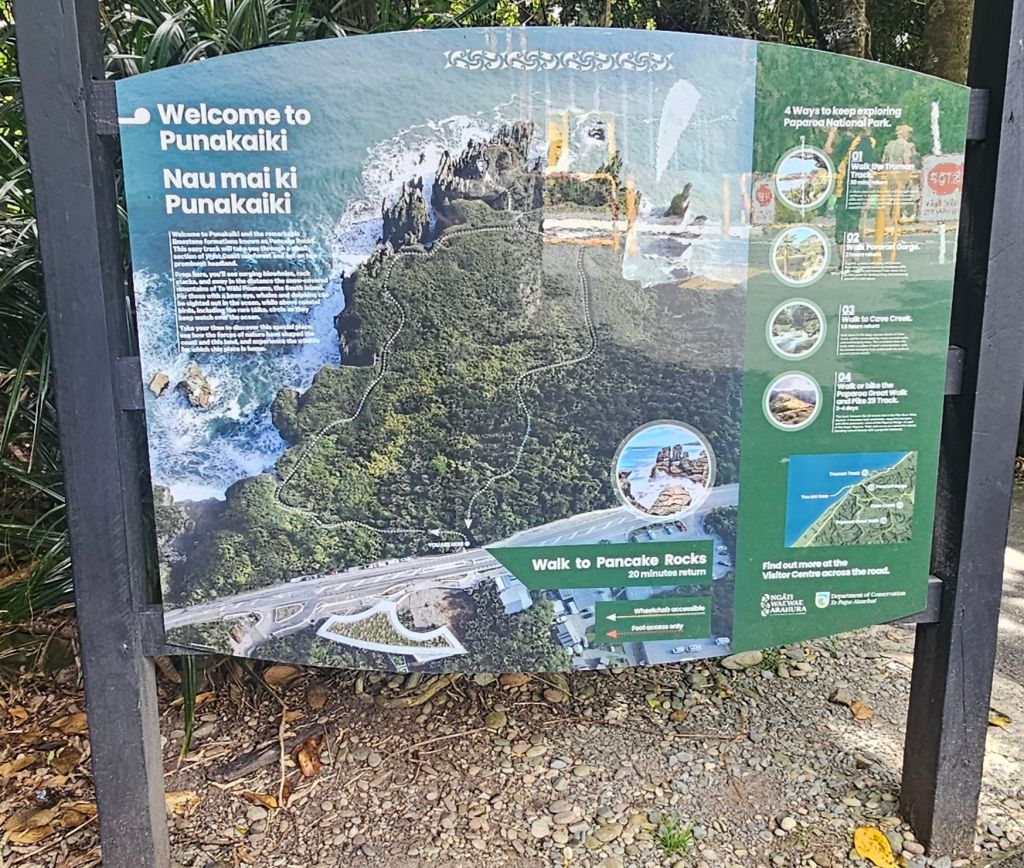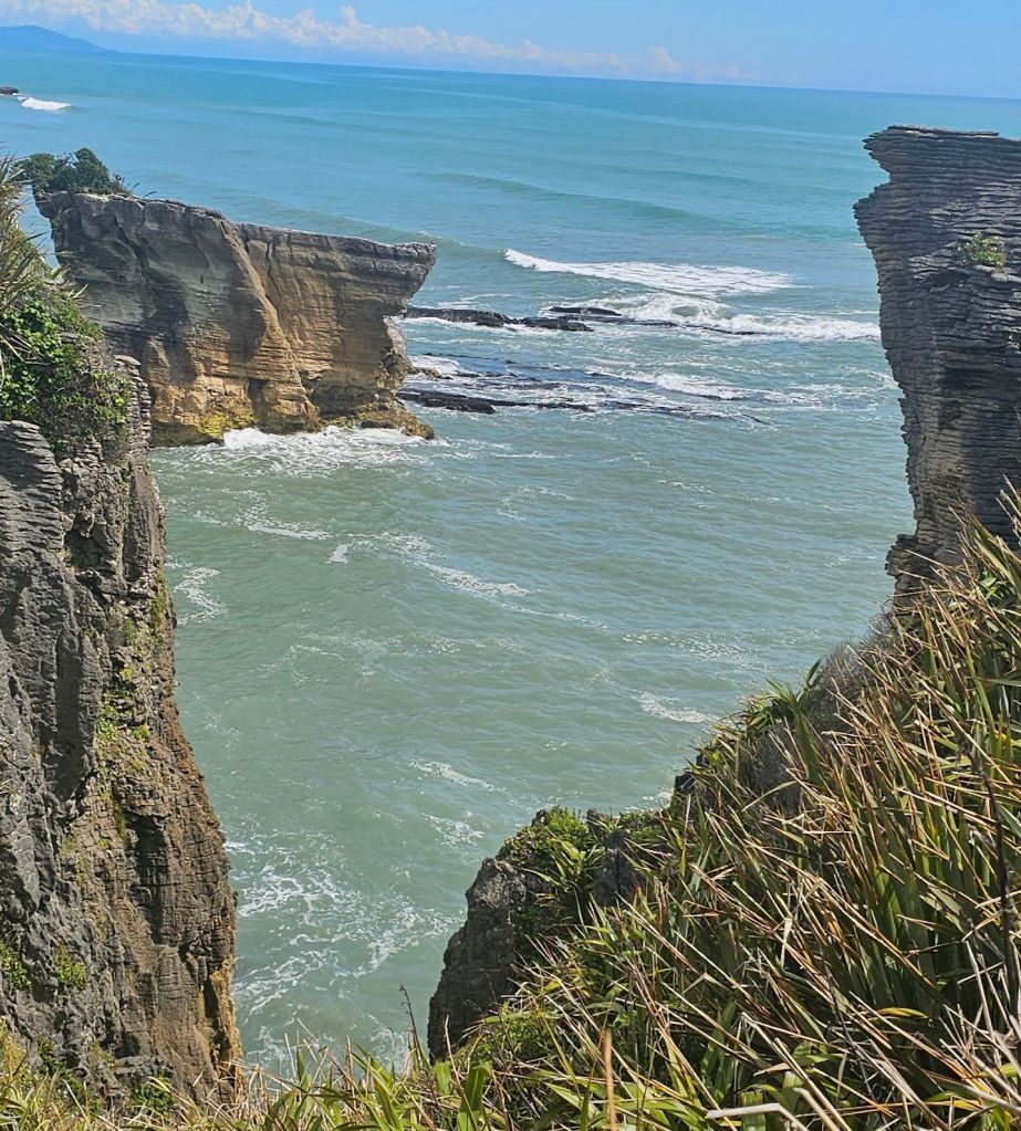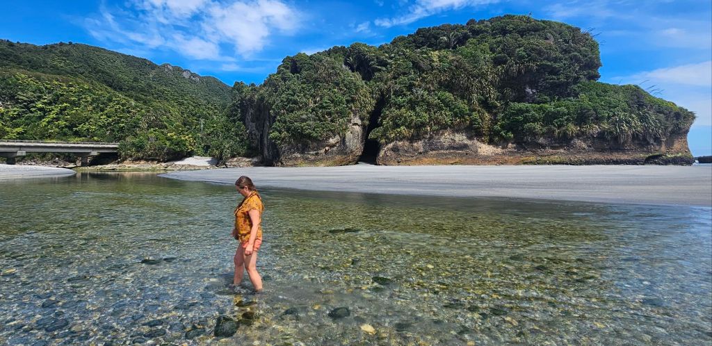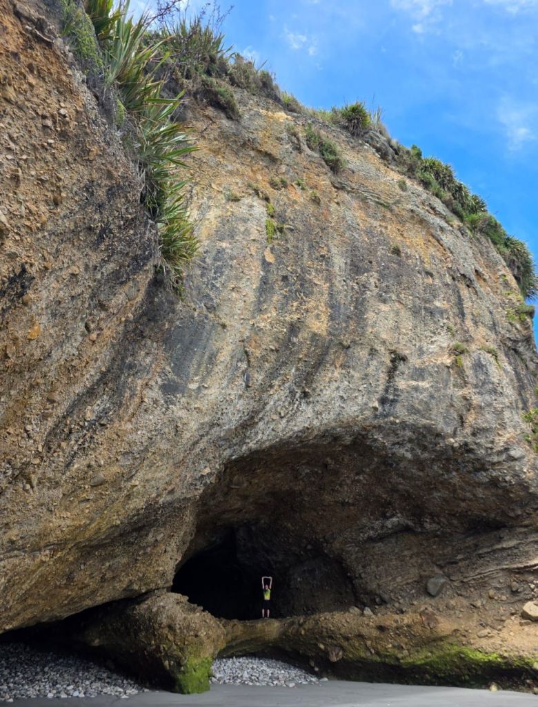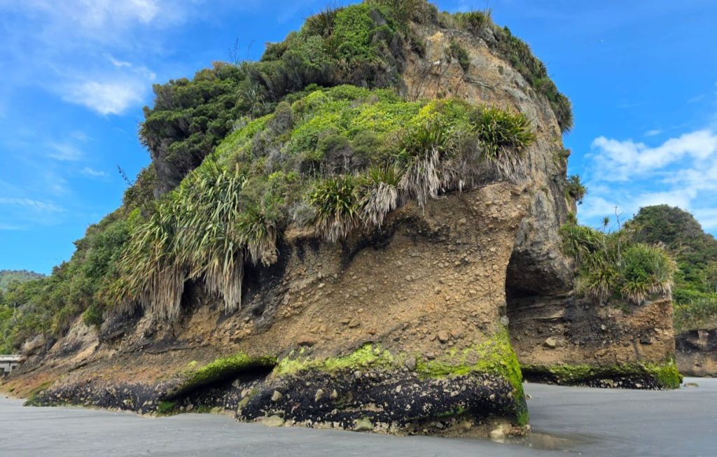 As we were leaving the beach a pick-up truck pulled alongside us. The dad got out so we said hello, behind him came was his wife carrying a picnic basket. They were subsequently followed by three very young children who all waved to say hi. All five were dressed in their traditional blue Maui costumes and ready for a day relaxing on the beach. Us however were off to reach our next adventure destination for the day, the Pancakes and Blowholes of Punakaiki.