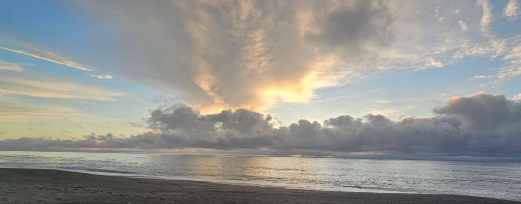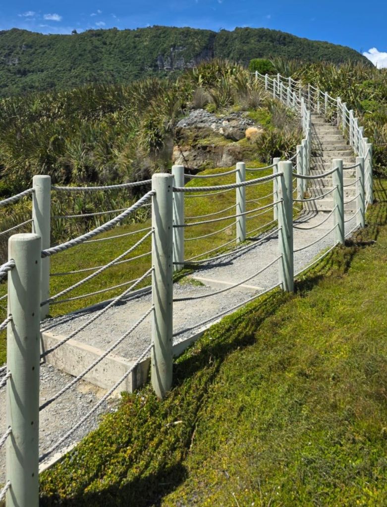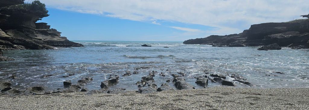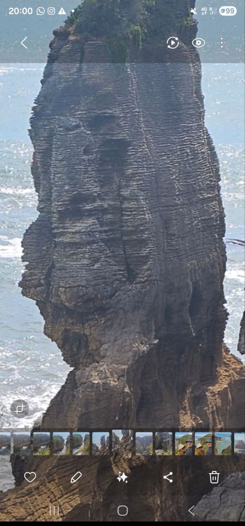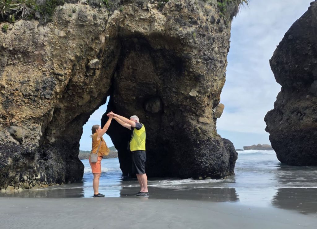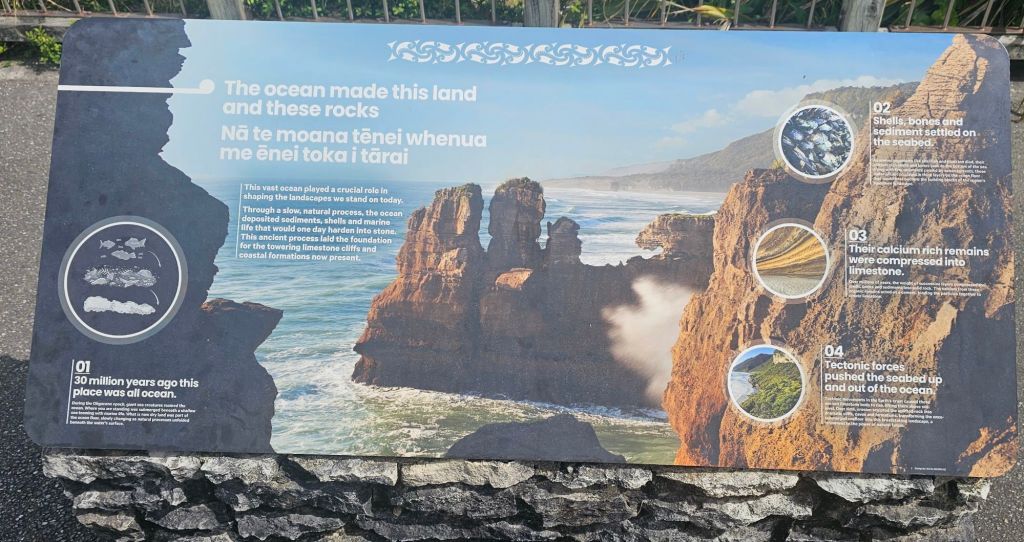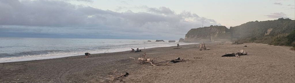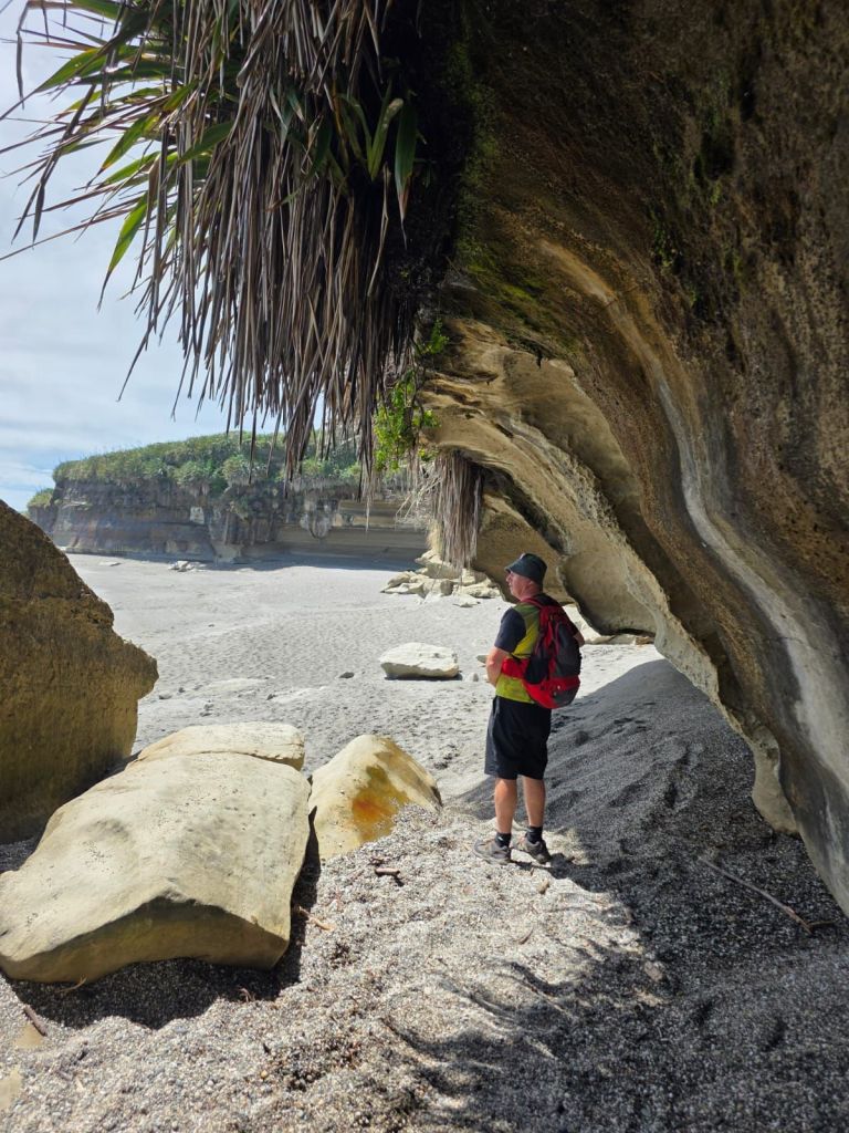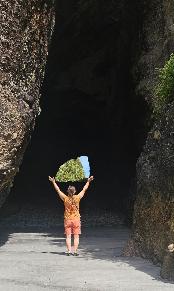 As we were leaving the beach a pick-up truck pulled alongside us. The dad got out so we said hello, behind him came was his wife carrying a picnic basket. They were subsequently followed by three very young children who all waved to say hi. All five were dressed in their traditional blue Maui costumes and ready for a day relaxing on the beach. Us however were off to reach our next adventure destination for the day, the Pancakes and Blowholes of Punakaiki.