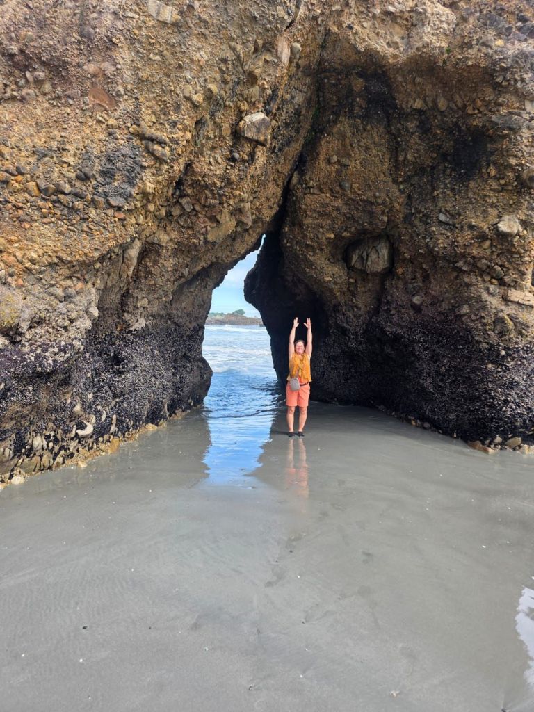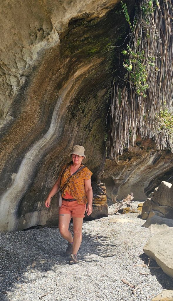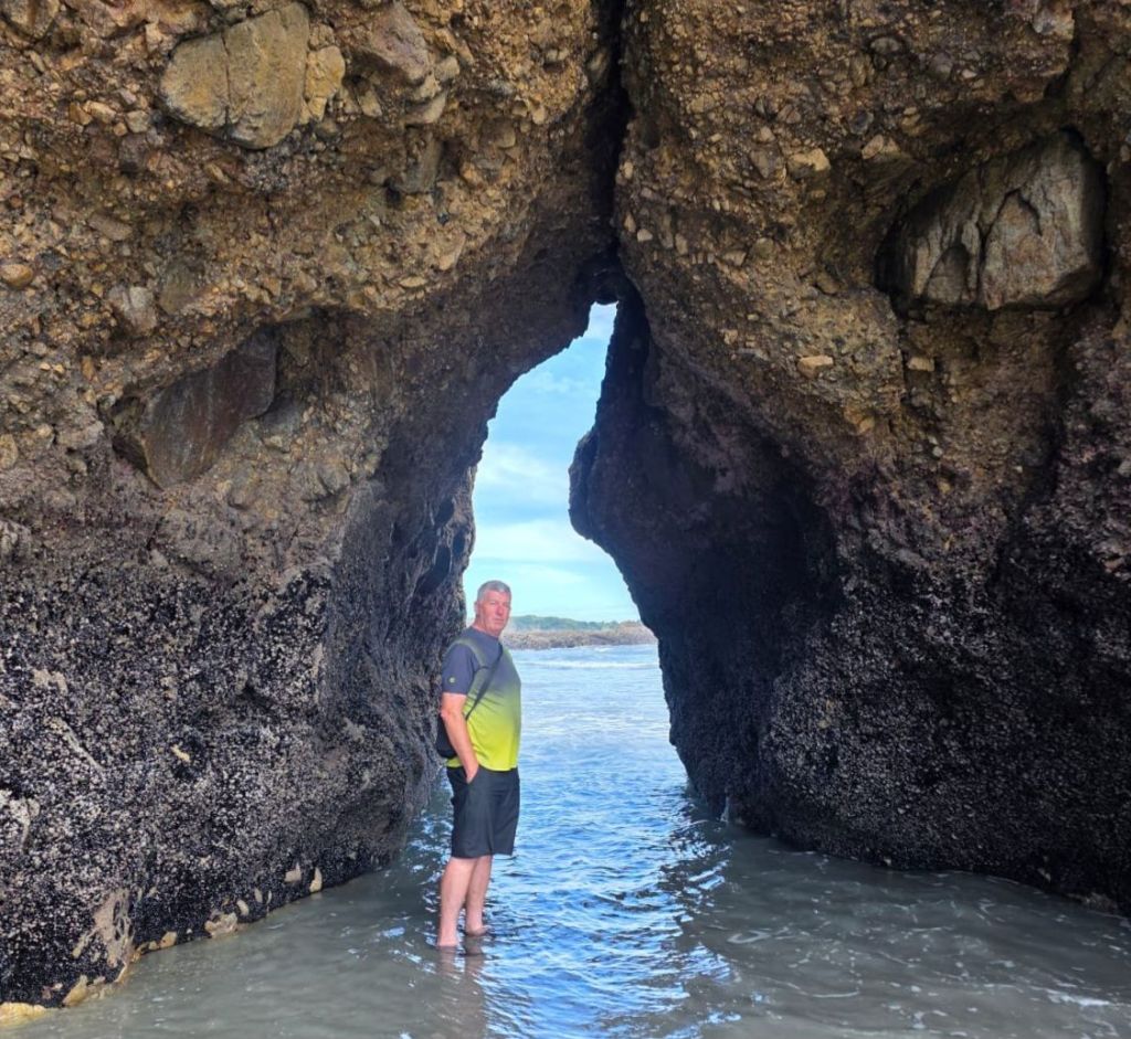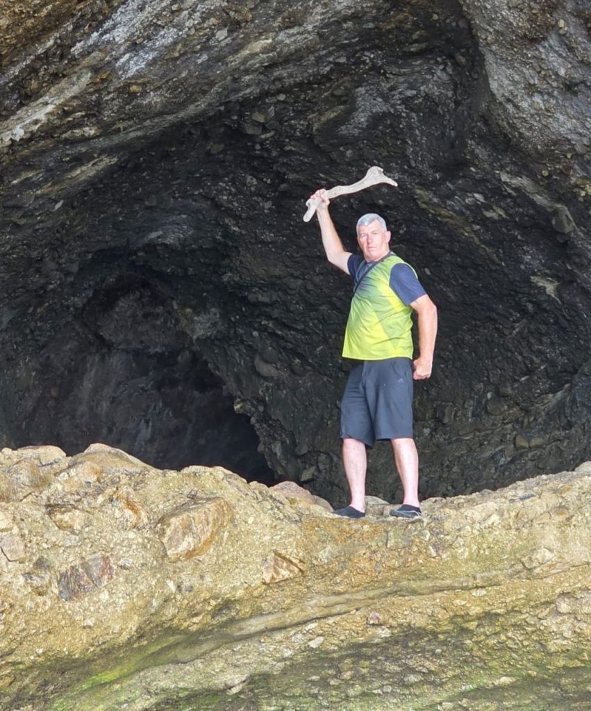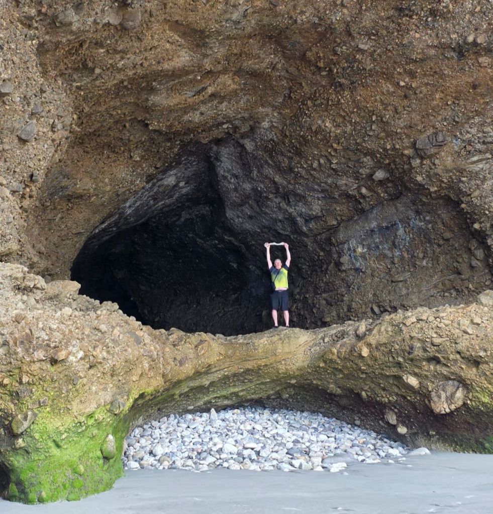 At one of our viewpoints we noticed some caves. Again these were only accessible at low tide which had just turned so we went straight there. When we got to the beach there was a driftwood chair for one, of course we tried it. We passed a few people who were disappointed, as although the tide was out, there was still the river to cross. This appeared shallow, but had a six foot trench running down to the sea. Undeterred, we rolled up our shorts, went up to our knees and followed the shallower part of the river down to the sea. A lucky break, where the river widened a bit, there was a sandbank to the other side. It was no deeper than what we were wading through so across we went. To ensure we returned to the same spot we drew a big arrow in the sand and took a photo of the rocks.