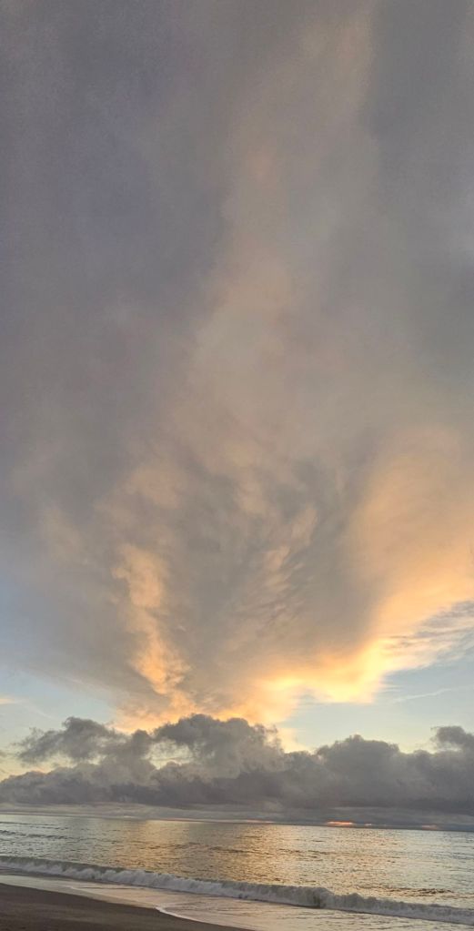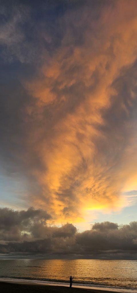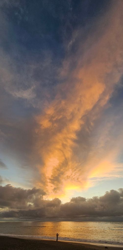Just as we are walking to the beach a police car came down the stand. They enforce the law for the council and issue the $200 fines for illegal parking as they only have limited self-contained van spaces you can use. He took an interest in the van, but it was just about in so he drove on through – phew. We got to the beach just in time to capture the sunset. Although there were very low clouds, the formation of them where the sun set looked like a volcano erupting in the distance. The sky was on fire.