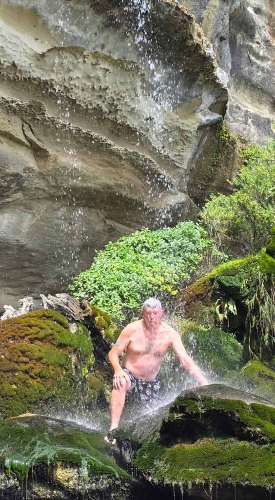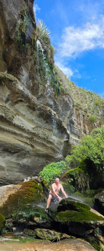 We stopped at a couple more view points, including a walk on the Truman Track. This proved to be a little gem. After a small walk we arrived at a viewing platform overlooking two beaches. Surprise surprise there were warning signs here. This time they advised that one of the beaches would be cut off at high tide. As it was still fairly low tide we proceeded to the beach. A lot of messing around and a very fresh shower from the cliff side waterfall before continuing the adventure to our main destination.