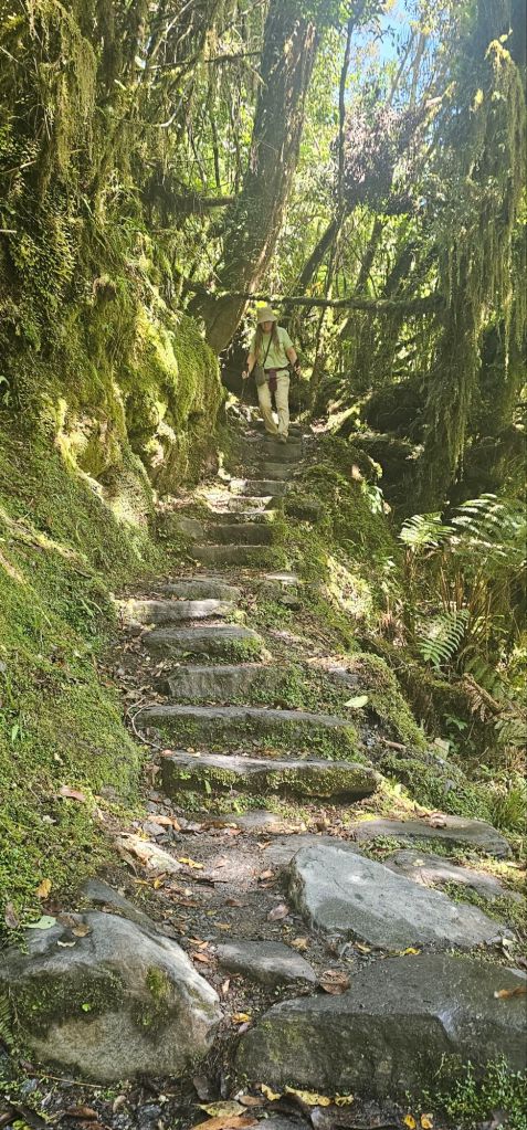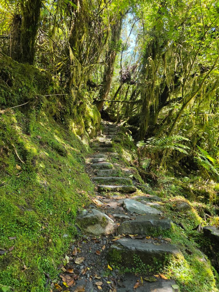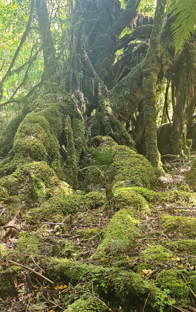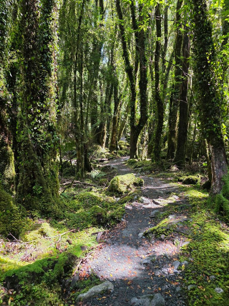 On the way back there was a slight detour, which wandered through the forest taking the Old Moraine Path off the Glacier Track in a crescent before returning to the main tourist walk. That sounded right up our street, so enter we did. There was no safety of a man-made gravel path, this was through ancient woodlands, very fitting of a ‘Lord of the Rings’ adventure. It felt that we were definitely getting more and more into the films amazing scenery, filmed over the North and South Islands of New Zealand. Every tree had a form of thick furry moss growing over it, or deep dark cavities hollowed in the trunks. The path, although man-made, was overgrown and was made of uneven blocks and stepping stones. The aura was of a medieval forest where bandits with bows and arrows might swing from the trees and take your worldly possessions or jump out of the hollow to steal your Maid Marion away.
