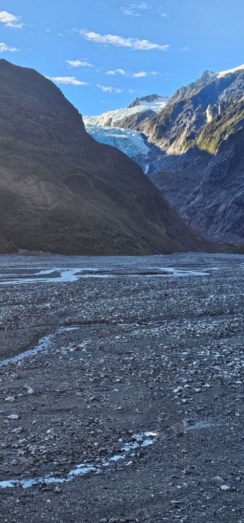 This powerful spectacle of ice with over 7000 years of life is shrinking ever so slowly, just as we all must do in old age. But also like all in old age, there are so many stories to tell. So much this magnificent, powerful and ever present sculpture has seen over time. Some might argue that it caused total destruction to everything in its path as it tore through the valley in its hayday without a care. But here in this one desolate land of rocks it has brought new life all around. The hills and valleys that are full of rainforests, unique ecosystems and an abundance of life not seen anywhere else on the planet. From it’s little blue penguins to the national kiwi bird, species thrive, due in part to these glaciers moving through the mountains whilst releasing water into the atmosphere. The valleys they created on their original journeys now have rivers flowing in them with fresh water entering twenty-four seven from the constant flow of the waterfalls. Even the pictures of this blueish white giant don’t show that in places it could be one to two miles deep. Pure water from a time before man put a significant mark on the planet. Although the same valleys may have seen other glaciers before this one, each leaves it’s own mark on the landscape as they raged through the mountains tearing and transporting giant boulders to new and distant locations. These can be scattered all along the river bed.