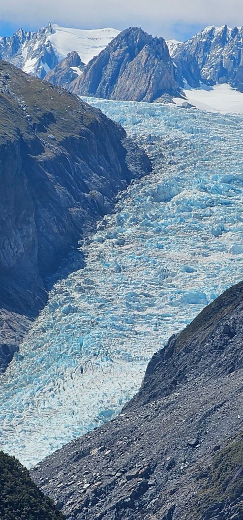 OMG, what a difference a day makes. We followed the same path as yesterday, though it was hardly recognisable in the sunny blue sky. Once we arrived at the viewpoint we were gobsmacked by a number of different elements. Firstly, Mark Martini looked much friendlier in the sun. The waterfall that was coming down the side of the mountain had suddenly gained a family with siblings and cousins all along the walls of the valley for as far as you could see, which was at least thirty kilometres more than yesterday. But the jewel in the crown, actually the whole crown of jewels rolled into one magnificently majestic piece of jewellery was the glacier. Like a Tiffany masterpiece with row upon row, column upon column of the most precious blue diamonds ascending down the neckline of the most iconic of models Katty Kutie with her long blonde hair waving to the sides, free like the river once flowed.