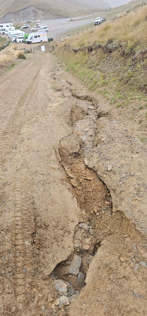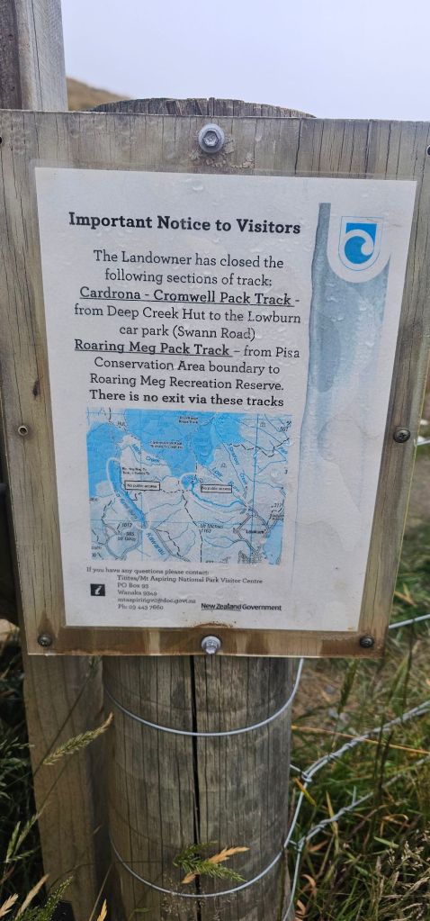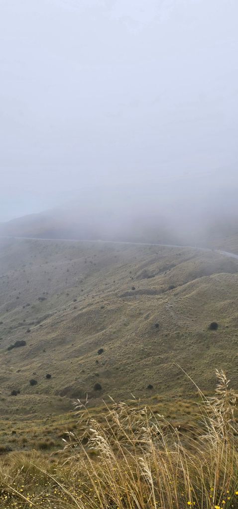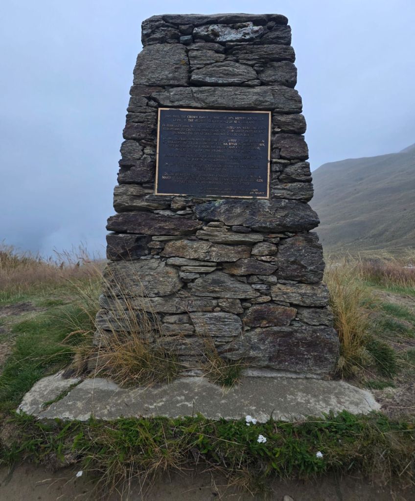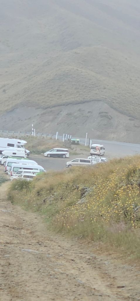 Wanting to get away quickly before the local shop or land owners realised we had stayed the night we left at 06:30. Of course we used the spotless amenities next to the church because the place we were going to promised to have a not so pleasant toilet experience. We were heading over the mountains on The Crown Range. As the summit was a camping night spot, we arranged to have breakfast there. The Crown Range boasts the highest sealed road (tarmac) across all of New Zealand. With the temperature already at 6⁰C it was sure to get colder near the summit, almost freezing.
