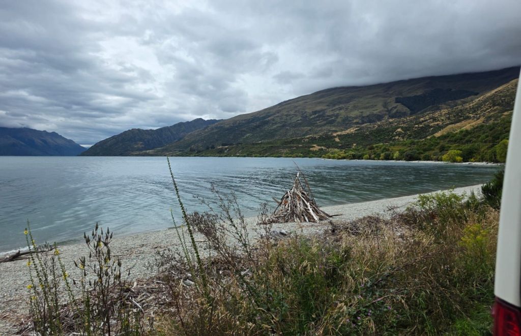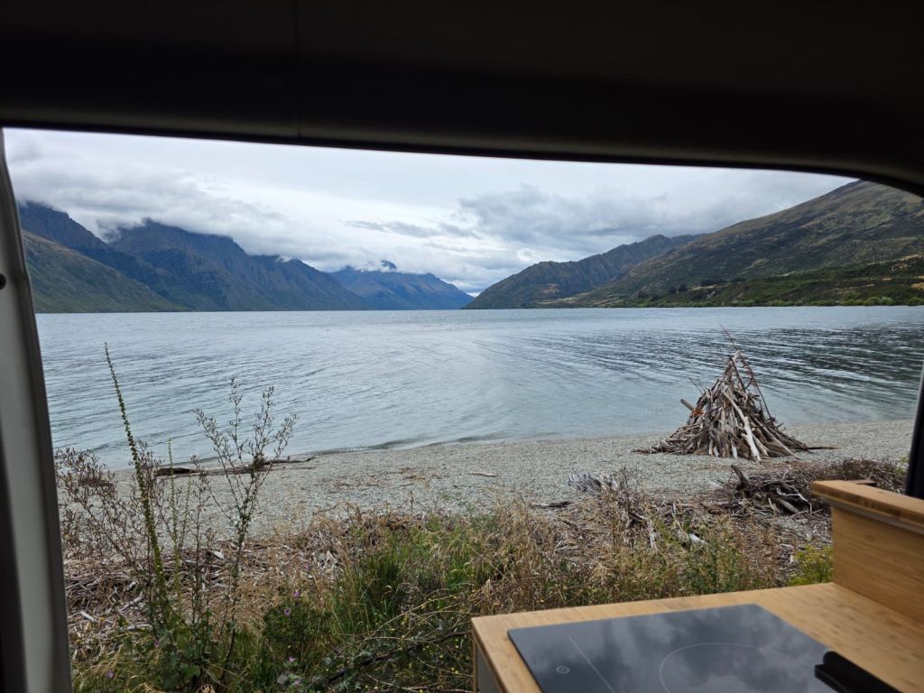We left Queenstown and headed for Kingston Lakes via the Southern Scenic Route, passing and stopping at Lake Wakatipu. This was the first and biggest freedom camp for miles. We got their early as there were allegedly only fifty pitches. There was still over fifty when we stopped but they had all left a private, semi secluded pitch next to the lake free. Not hesitating we pulled in and staked our claim. For the next few hours campervans, motorhomes and estate cars where people would sleep pulled in. Everyone finding a piece of gravel or grass they could. There was easily over a hundred vehicles stopping for the night, we reckoned in excess of 150. A few brave souls went swimming in the glacier lake. They lasted about twenty seconds. A couple of young German lads sat just opposite us and started fishing while others were strolling along the small beach area. For so many people it was a very quiet camp with most settling down before 20:30. That had been a constant feature on our travels, everyone settles in their vehicles really early. We guess with the nature of activities people are doing, especially trekking up mountains or white knuckle activities, everyone is either wrecked or saving their strength to do it all again the next day..