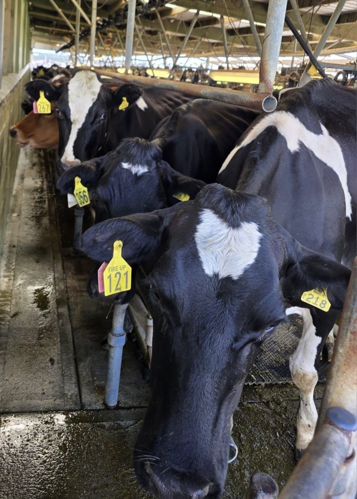 Returning to the farm after our feast we went to see ‘The Ladies of the Meadow’ being milked which is a big part of Ben’s job. Today though, as the 600 strong herd were being milked, there was a new Milk Maid in town. Ben very kindly thrust Sarah the milking unit and asked her to crack on. Confidently (or maybe not) Sarah attached the teatcup shells to the teats on the udders and let out a screech as the automatic suction took hold. The cow didn’t know what to make of it and neither did the ones leaving the shed on the other side. One cow slightly slipped sending a bombardment of exocet missles of cow sh*t in our general direction. Yours truly took the blunt of the assault, and I’m sure I saw the cow laughing all the way over the moon as it exited. More washing to do, lol.