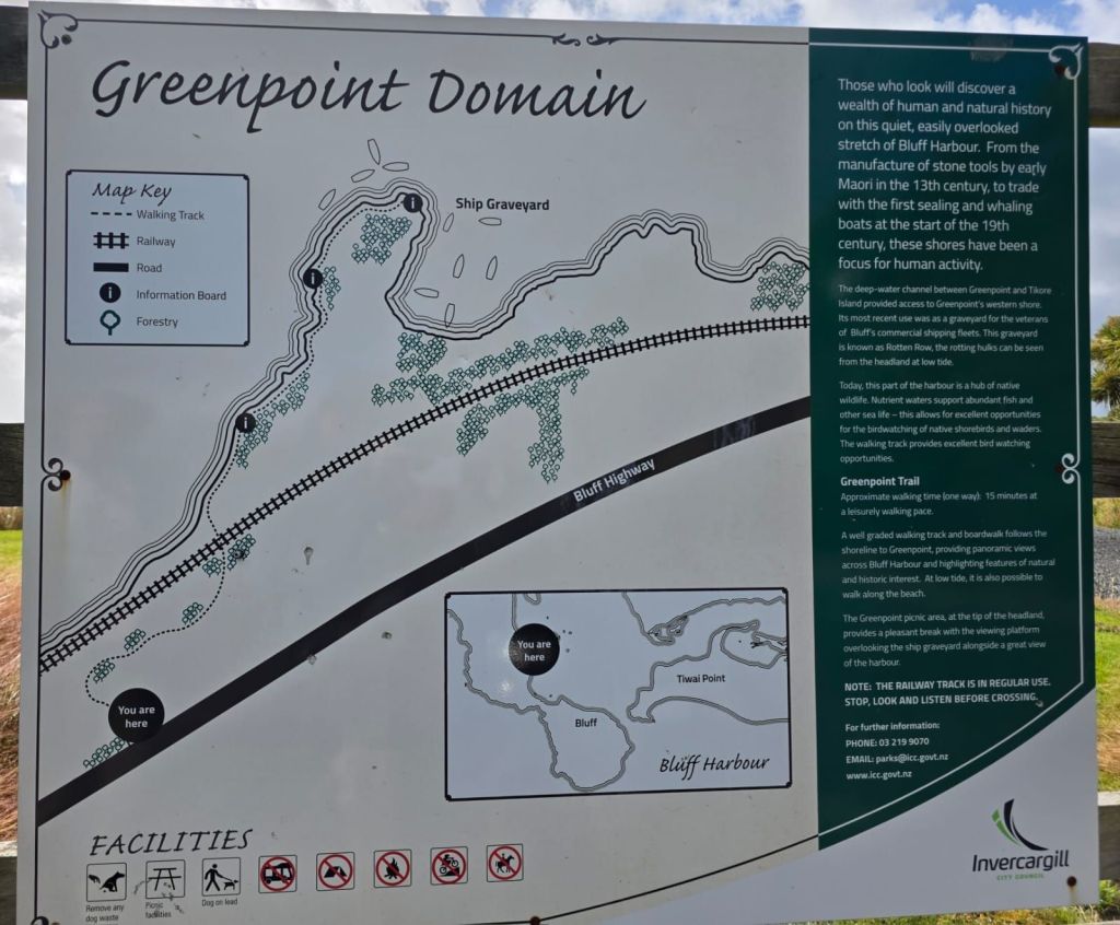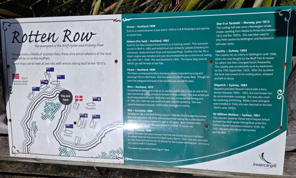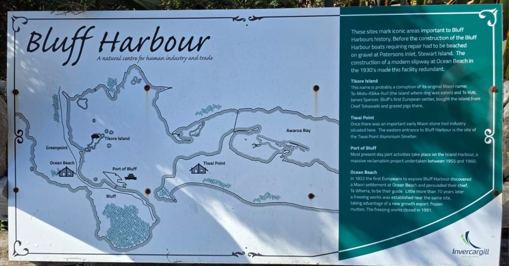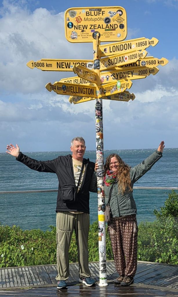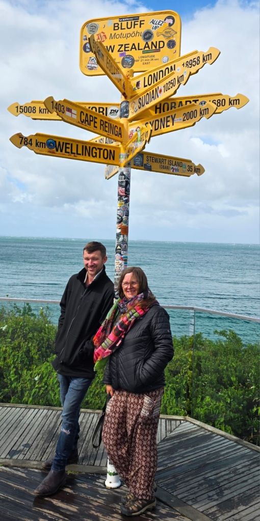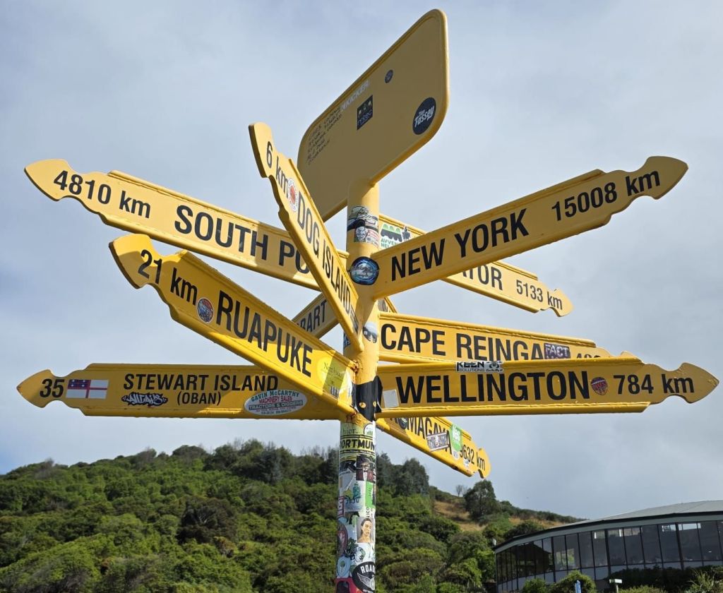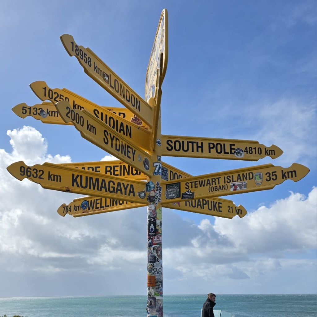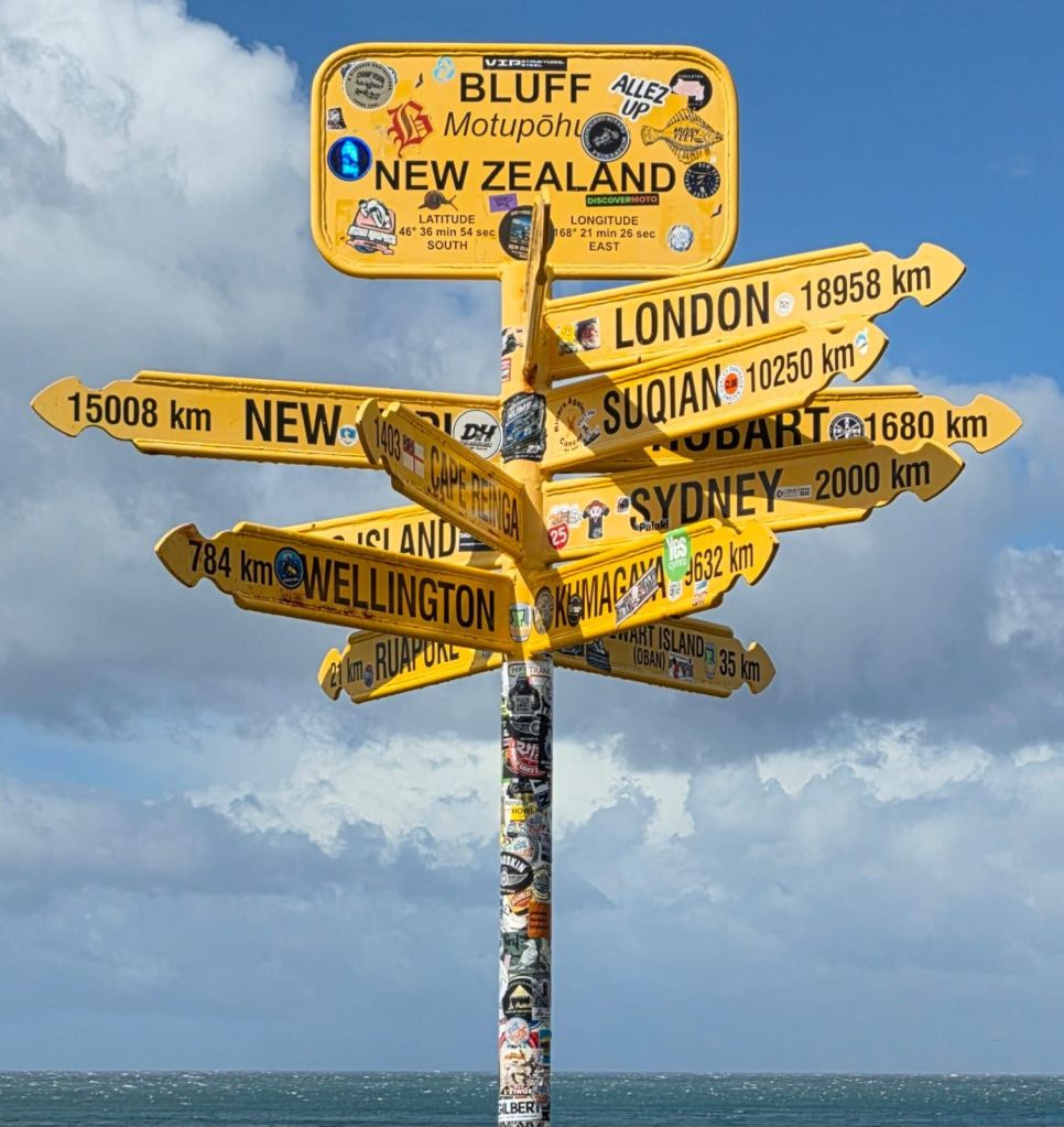 We were in Bluff, of which the most southerly point on the mainland, is Stirling Point. The rains had stopped. Being tourists we had to have our ‘Land’s End’ moment. Though this had a more interesting outlook: look left – South America; look right – South America; look south – Antarctica; look north – the car park.