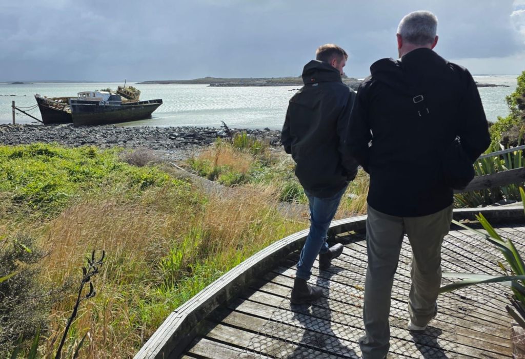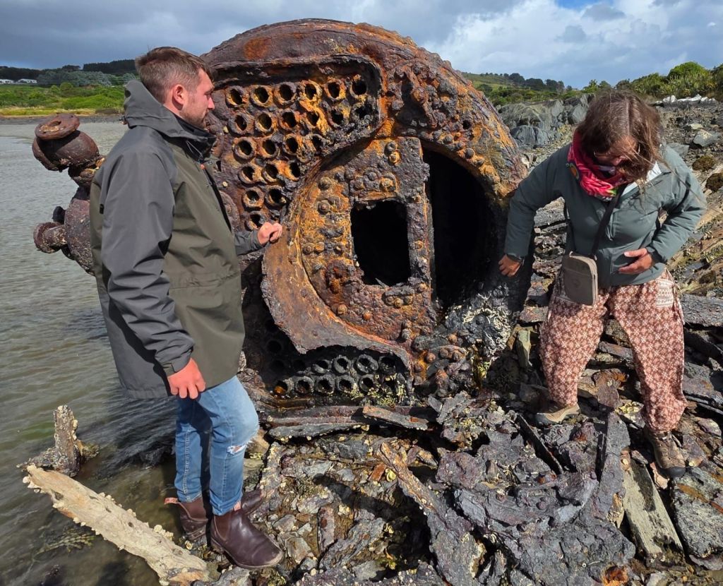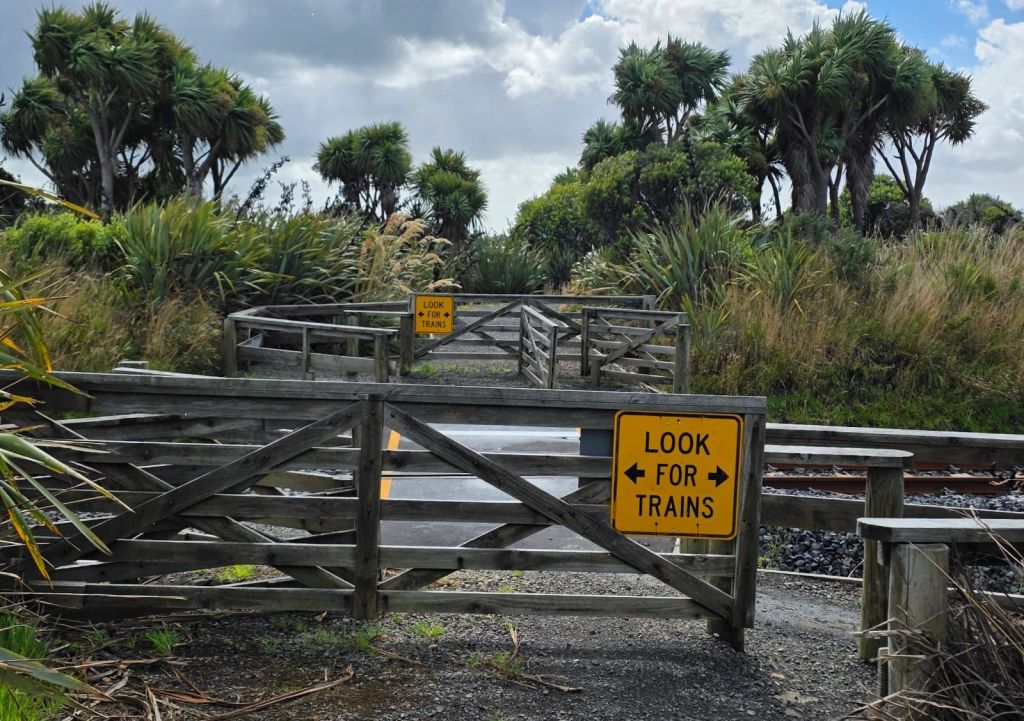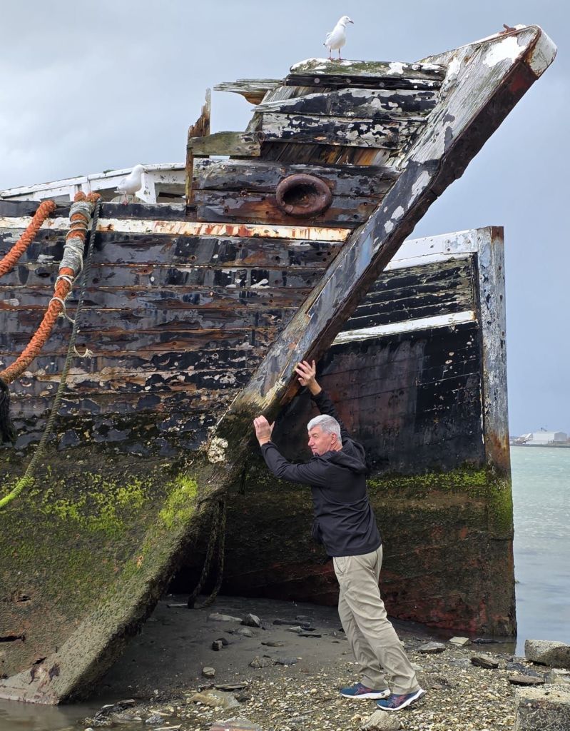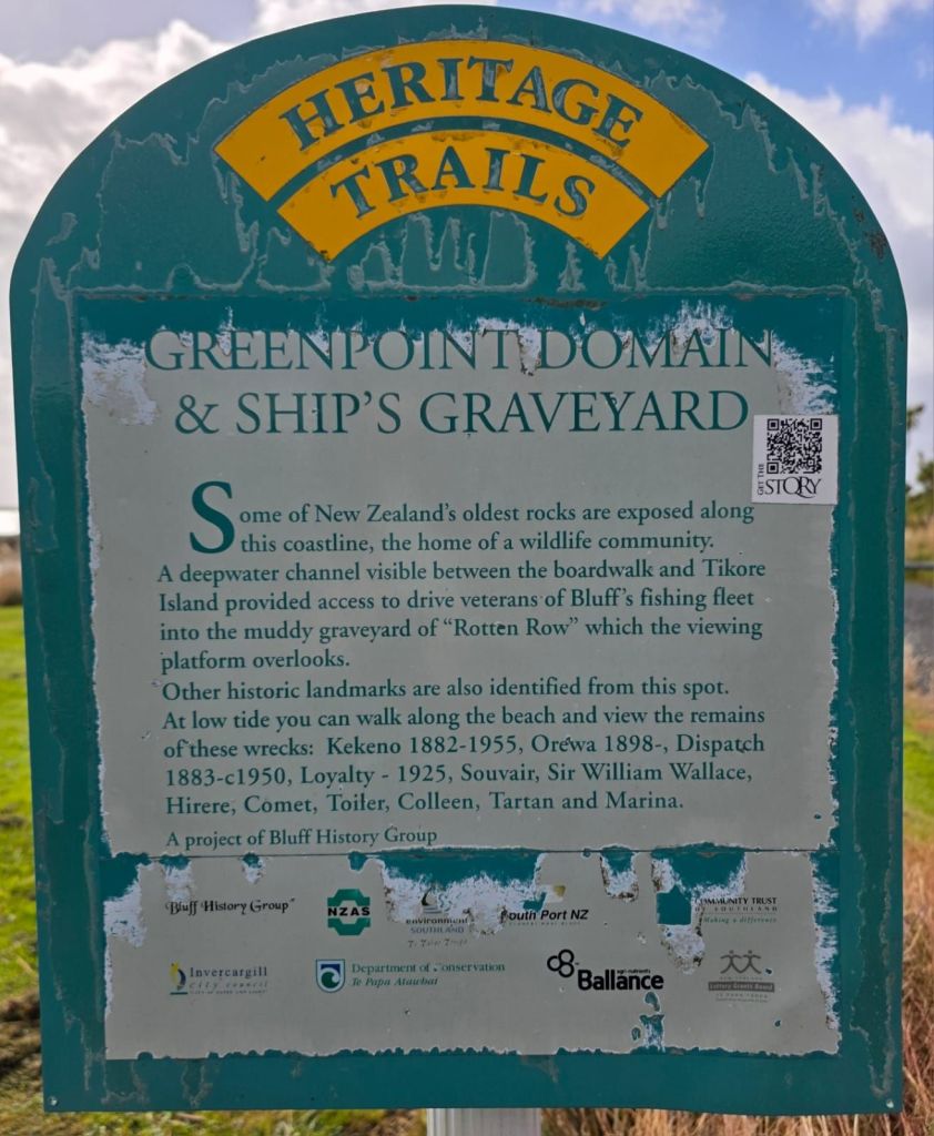 On our way, and off the beach, killing at least twenty minutes off our journey, we headed for our next desination. We parked up and walked across the railway track, down the boardwalk and out on to the Ship Graveyard. Another attraction that would have cost an arm and a leg to visit back in the UK, but parking and the activity cost nowt here. There were no health and safety restrictions either. If you hurt yourself it’s your fault for not adhering to the danger signs. I wonder if any of the eleven sunken vessel captains tried to sue New Zealand for having rocks in the ocean.