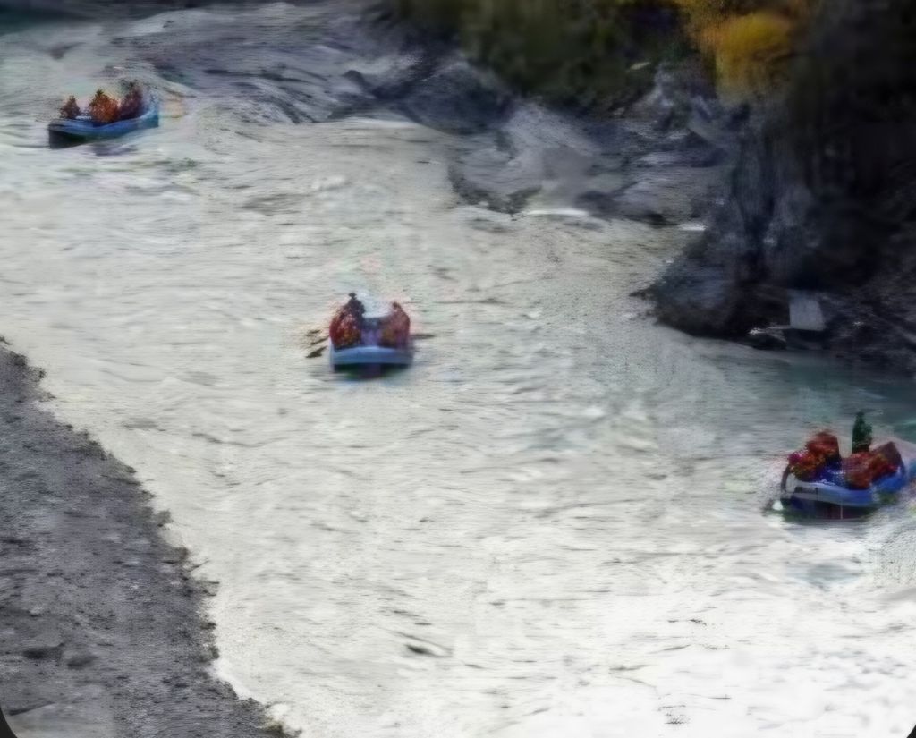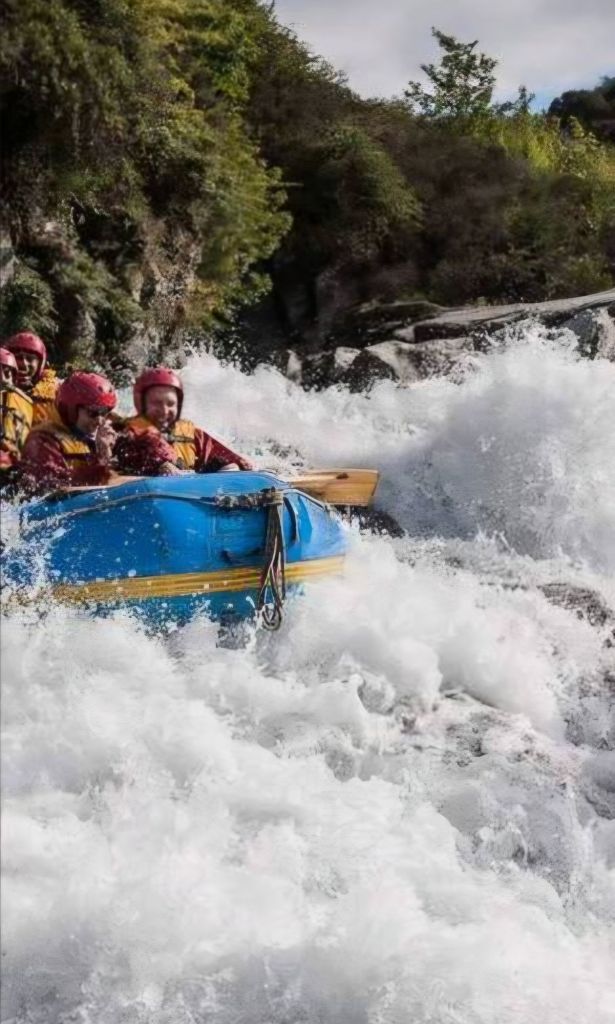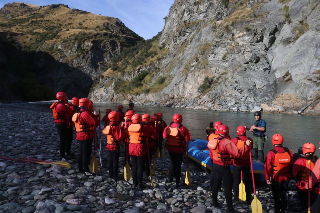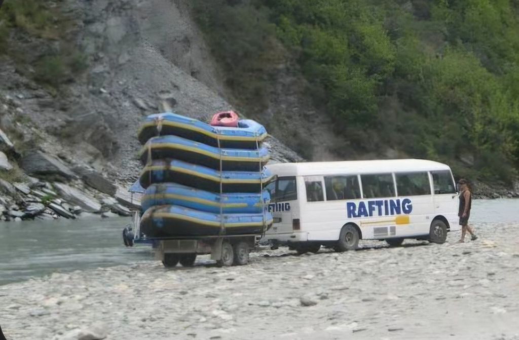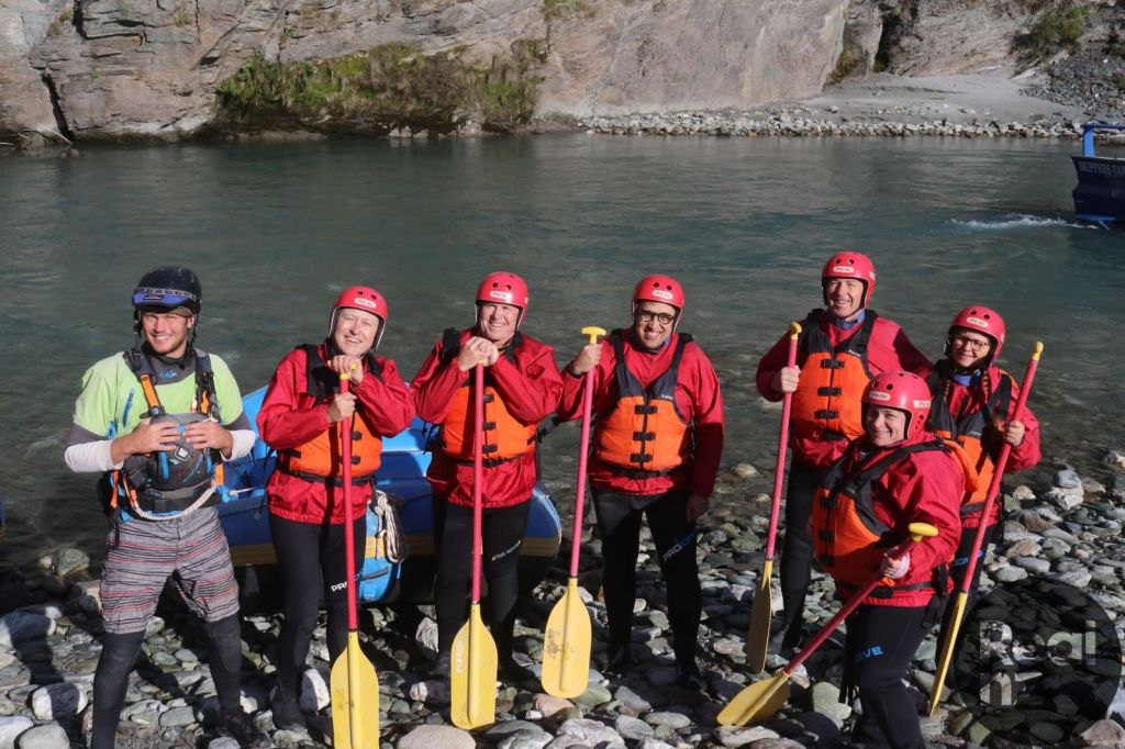 A nice leisurely paddle to our get out point was the order of the day. Suddenly, and at an incredible speed around the corner, came the famous Shotover Jet. This marvelous boat can ride in six inches of water and was invented by a local resident to ride the Shotover. You now see these masterpieces of technology in any area that does outdoor extreme water sports across the globe. They can spin on a sixpence and give a ride of pure speed and agility. You could see the joy and fear etched on each of the passengers’ faces. This was an adrenaline rush of a different kind but we wouldn’t have swapped it for ours. Three of these passed us in quick succession giving us some nice waves to contend with. As they couldn’t jump up the Cascade Rapid then it was just a matter of seconds before they shot passed us again, quickly disappearing in the distance. Our landing site was ahead, so we promptly jumped out of the raft, carried it to the trailer, dropped off our paddles and went up the hill for a shower and change back into it ‘civvies’, chatting to other adrenaline seakers along the way.