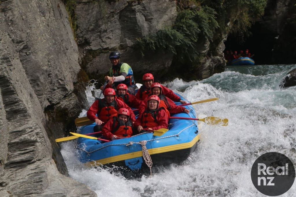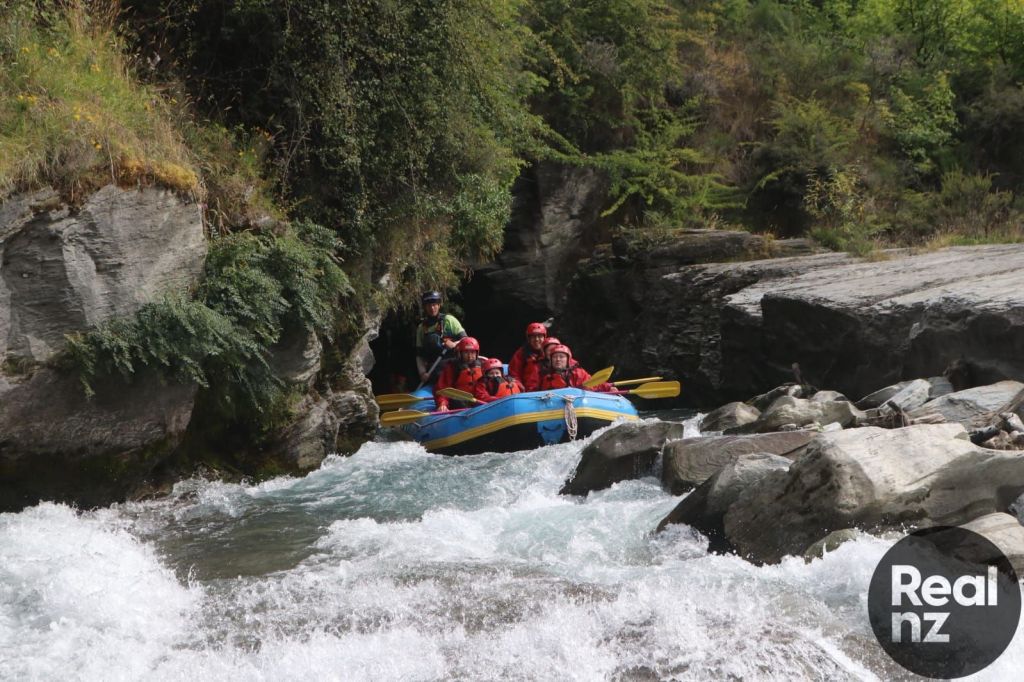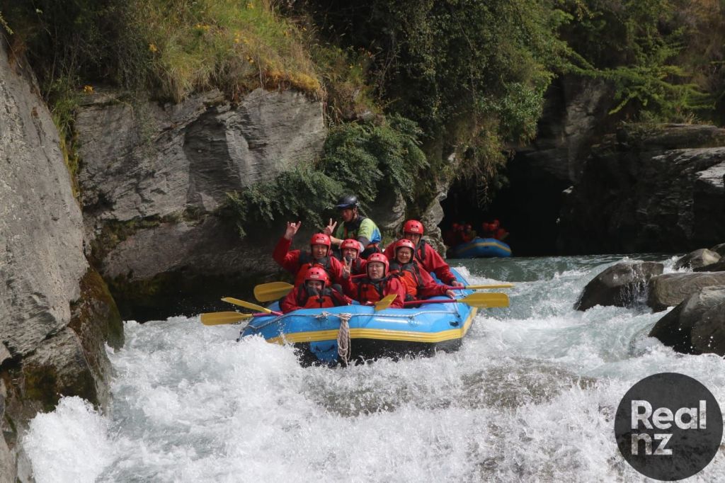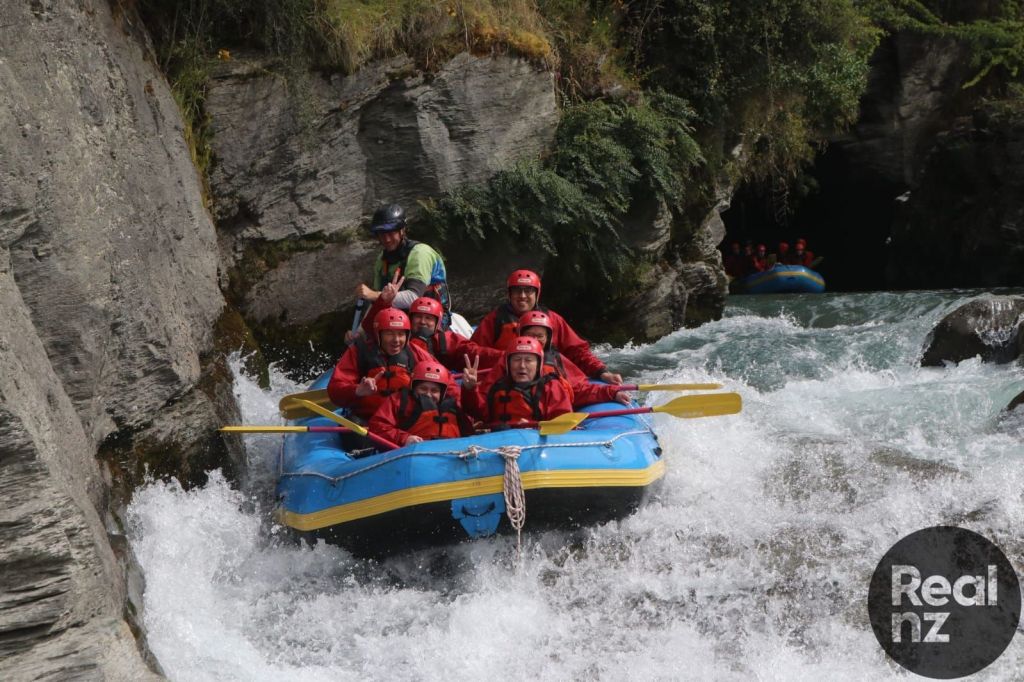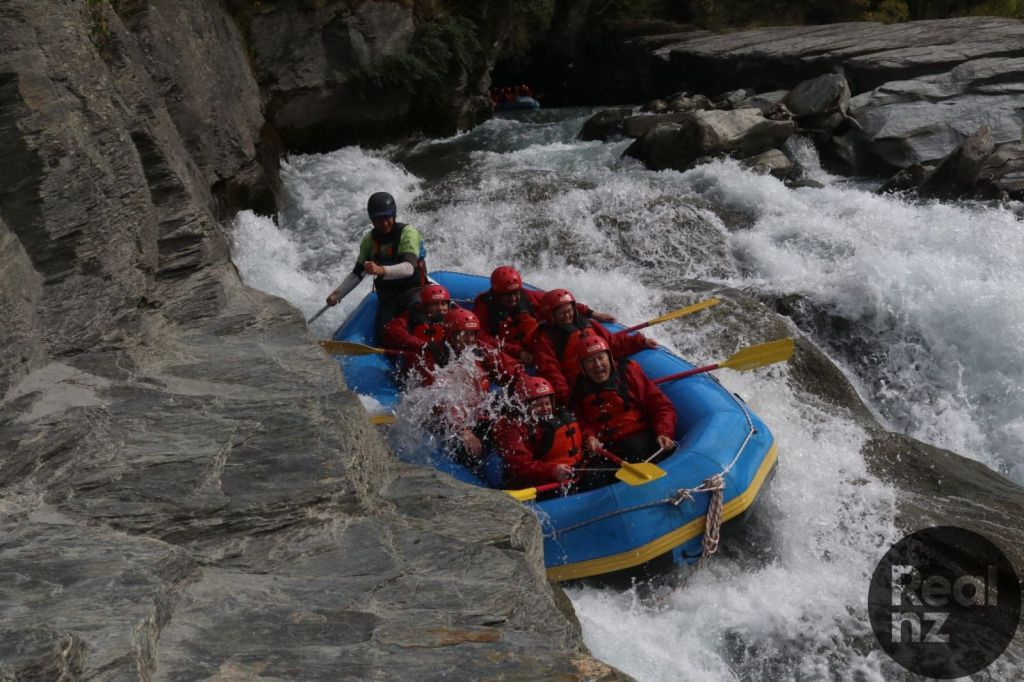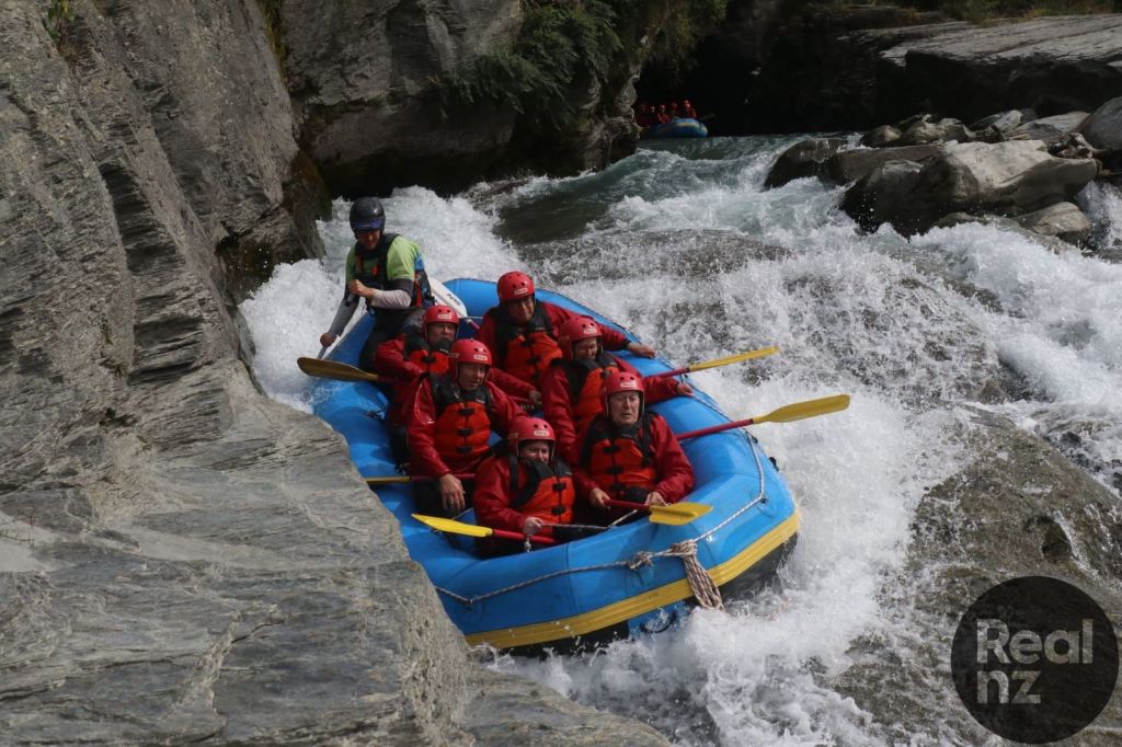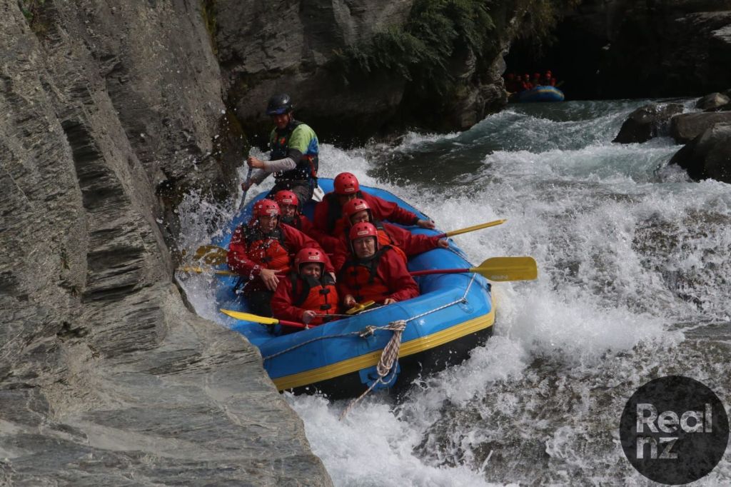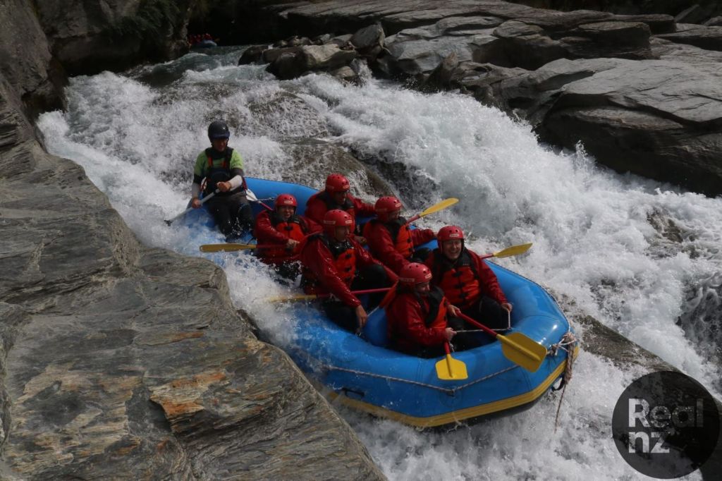 We didn’t go through fast enough, but the Chief (Mona Roa Chief Haare) must have been looking down on us from the skies above, as somehow we made it through. Bumping, crashing, tipping slightly, paddling again before the next bombardment of natural abuse from this unforgiving river. We were battered like a piece of cod in a fish n chip shop, tossed like a pancake, hit like a Mike Tyson right hook but we survived again and again. The sheer thrill of this harassment and with adrenaline pumping and flowing through every vein had us on the edge of our seats literally hanging on for dear life. Between each barrage of thunderous roars from the rapids Finn would shout for us to get up and paddle forward or paddle hard. We hardly had time to take a breath before the tumbleweed effect on our raft started over again and again. Rocking and rolling like a 50s hop we bounced up and down, sometimes huge drops before the speed of the river had us bouncing along once more. One minute we were facing forward the next we were facing backwards, all the time speeding through these natural individuals courses that made Takeshi’s Castle look like a walk in the park. Spurred on by our earlier disaster, we all pulled together and rode out the storm beneath us. We were through The Cheif and gave a celebratory cheer and paddle high- five whilst knowing The Shotover hadn’t finished with us yet and there was plenty more to come. Unfortunately, in one of the boats behind a young lady was somehow in the water and being tossed about with the relentless crashing into rocks. This really didn’t look good but she seemed to weather the storm. Someone from another raft threw a rope in but she missed it. Finn threw a second rope for her and shouted for her to grab it. She managed to cling to it as Finn reeled her in like a game-fisherman catching a blue fin tuna. Instead of fighting a fish, Finn was fighting all the elements whilst still giving us commands to navigate to a safe eddy (a slack area of calmer water). Once she was at the edge of our raft Finn and the Essex man behind me grabbed her bouyancy aid and pulled her in. She was in good spirits and laughing about it. We noticed a big tear in her wetsuit at thigh height but on checking no cuts thankfully. Her raft pulled alongside and she was transferred back. Her two giggling Asian friends hugged her, all three laughing and chatting as we left them carrying on our merry way.